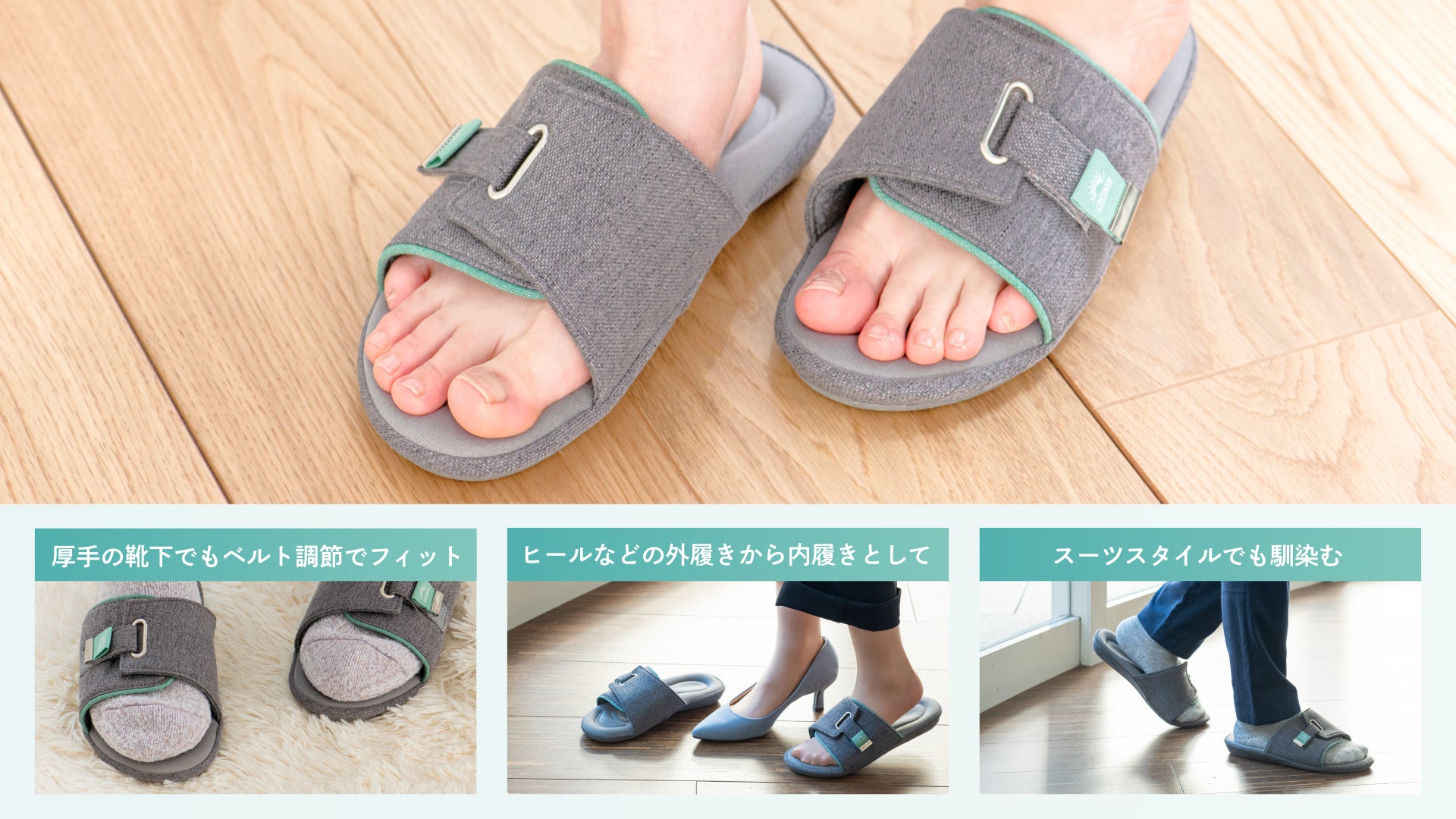 好みに合わせてサイズを自由に調整可能。さらにベルトをゆるめて、足も気持ちもふわっとゆるめるスリッパです。
