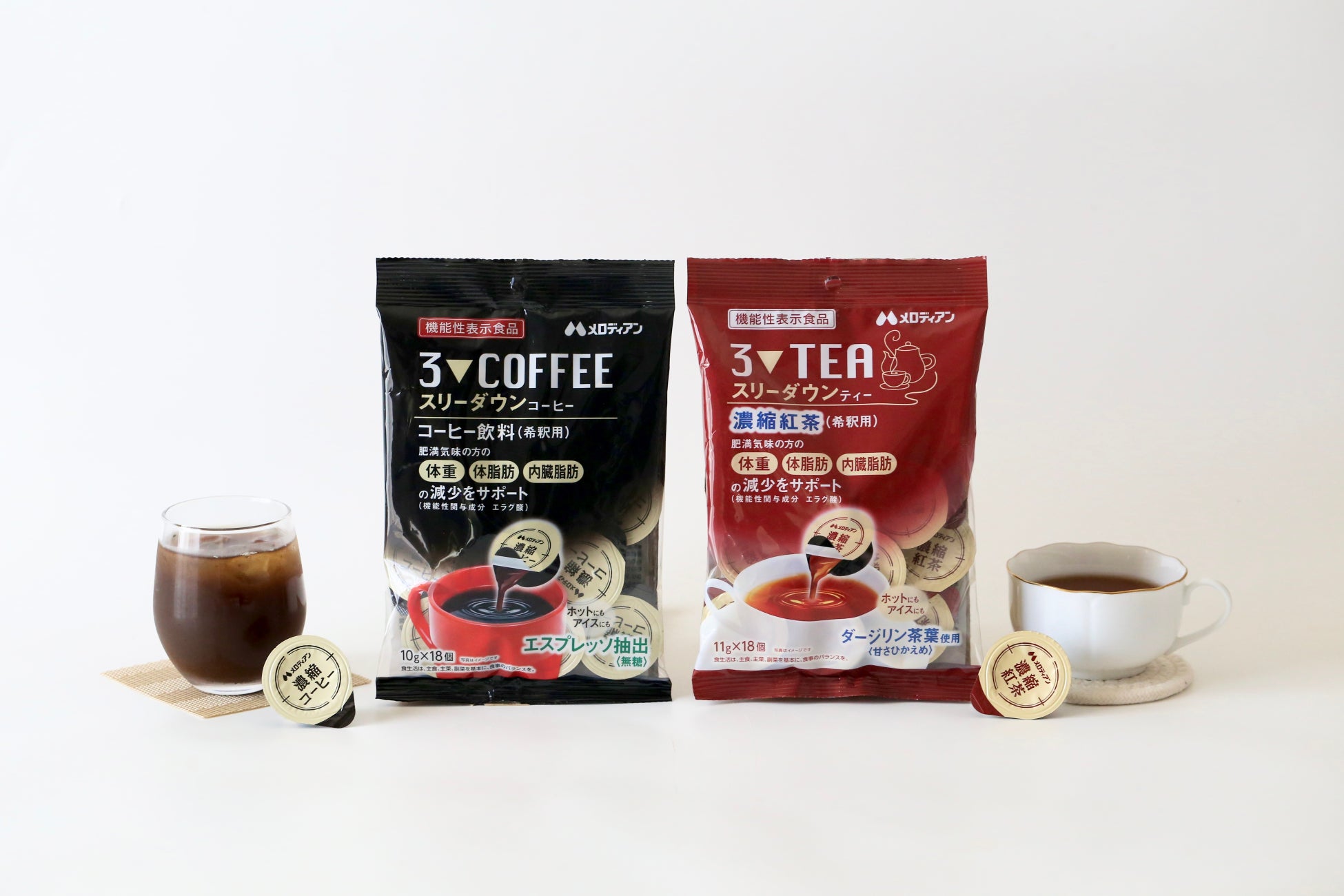 濃縮ポーションタイプの「スリーダウンコーヒー」「スリーダウンティー」も販売中。