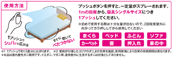 1プッシュでダニよけ成分が約1.5畳分に広がり、ダニをよせつけない。