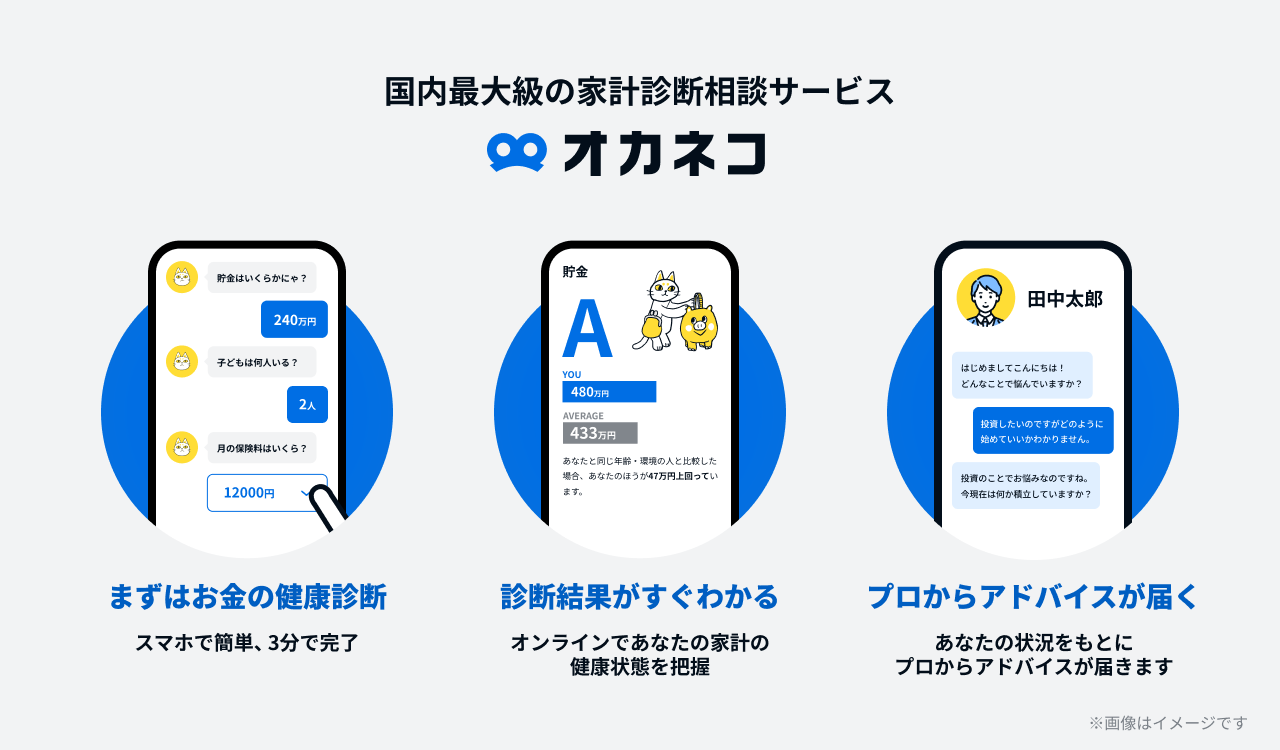 スマホから居住地や年齢、年収、家族構成などの質問に答えるだけで、同地域・同年代の人と比較し、ユーザーの家計状況を診断。その後、診断結果をもとにFP(ファイナンシャルプランナー)やIFA(金融商品仲介業者)等のお金に関する専門家からアドバイスコメントが届き、ユーザーはチャットで気軽に相談することができるオンラインサービスです。