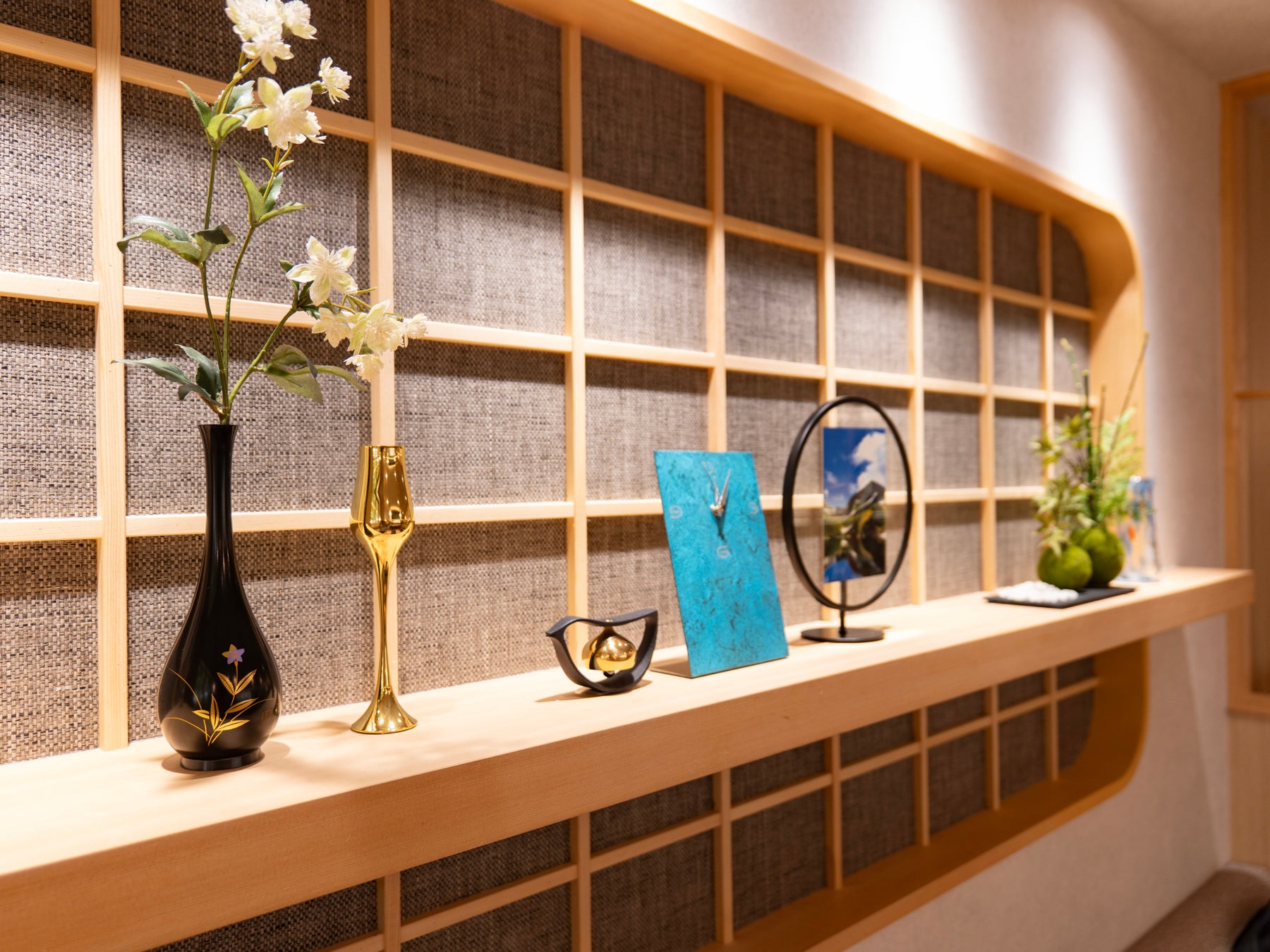 店内の内装は、富山県が有する北アルプスの雄大な落ち着いたイメージを和風モダンのデザインスタイルで表現。木のルーバーや格子が幾重にも折り重なるデザインで、山々が重なる雄大さを表しています。