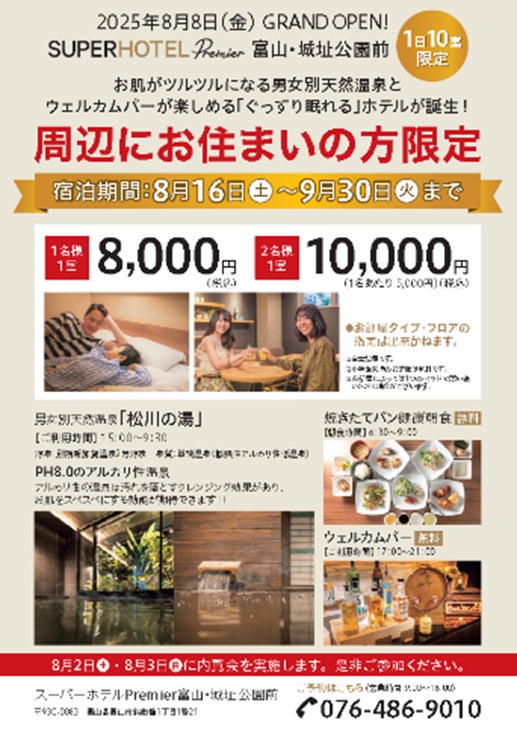 また開業を記念して、周辺地域にお住まいの方を対象に、8月 16日(土)~9月30日(火)まで特別価格で宿泊いただける「オープン記念地域限定プラン」もご用意しております。
