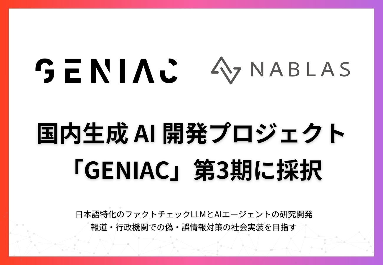 AI総合研究所として活動するNABLAS株式会社 (本社 : 東京都文京区本郷、 代表取締役 所長 : 中山 浩太郎、 以下「当社」)は、経済産業省および国立研究開発法人 新エネルギー・産業技術総合開発機構(以下「NEDO」)が実施する国内生成AI開発の推進プロジェクト(以下「GENIAC」)の第3期において、当社の「Factcheck RM とエージェントの開発研究」が採択されたことをお知らせします。これにより、日本語特化のファクトチェックLLMとAIエージェントの研究開発に対して助成を受け、報道・行政機関での偽・誤情報対策の社会実装を目指すとともに、生成AIが社会に広く浸透する中で、確かで信頼できる調査・ファクトチェック技術の社会実装を推進してまいります。