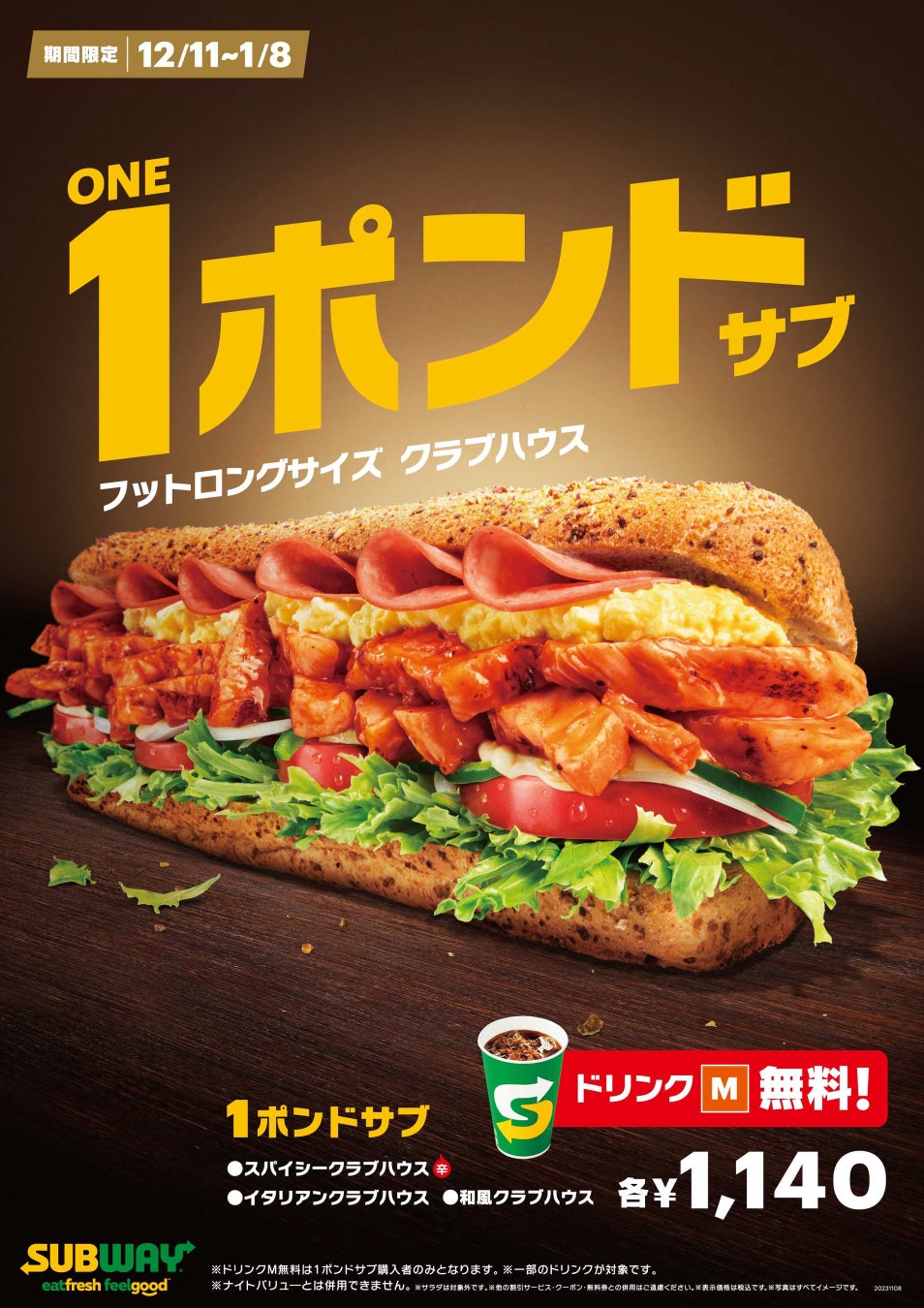 年末年始に1(ワン)ポンドサブでパワーをチャージ クラブハウスサンドのフットロングサイズのご購入でドリンク(Mサイズ)1個を期間限定でプレゼント