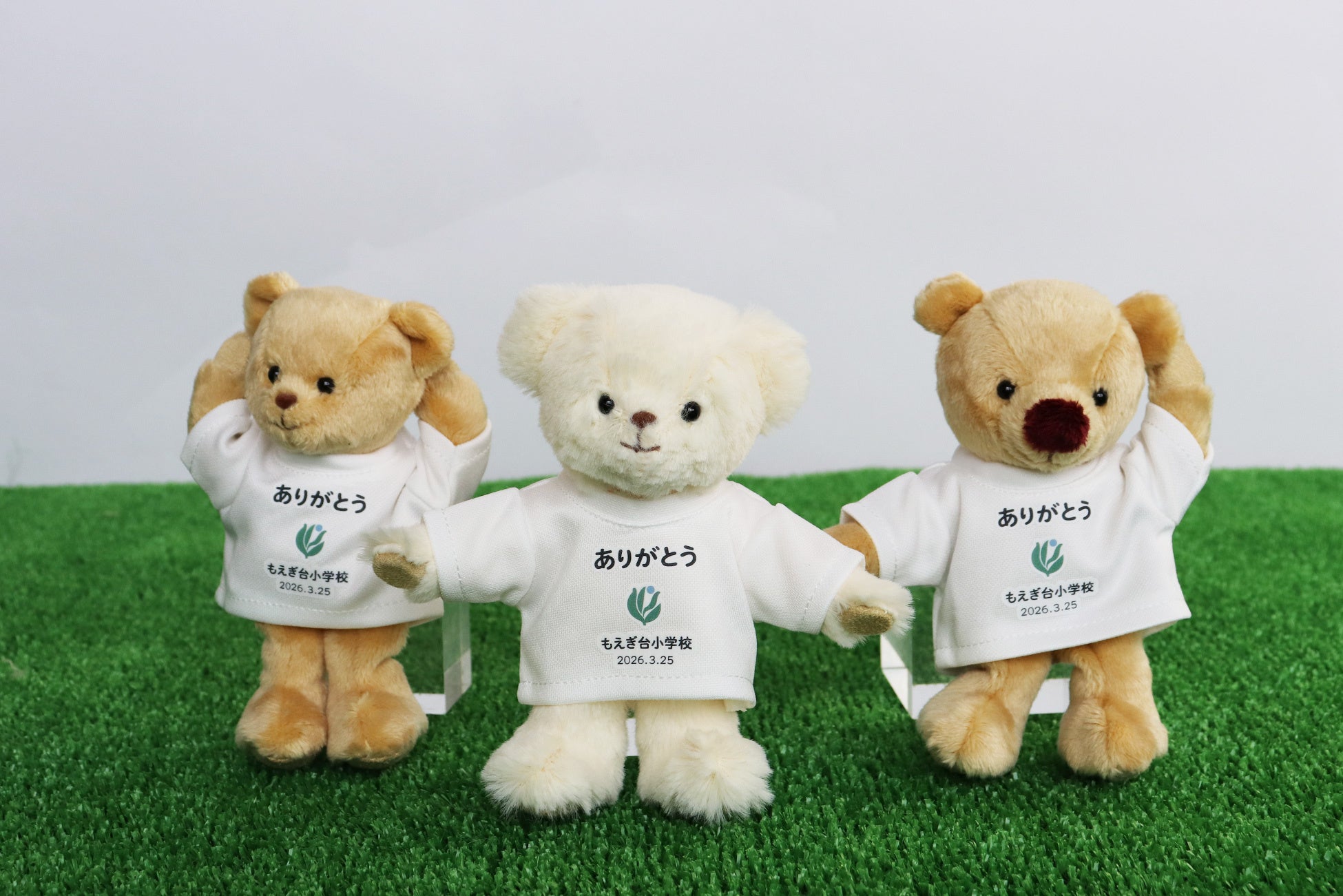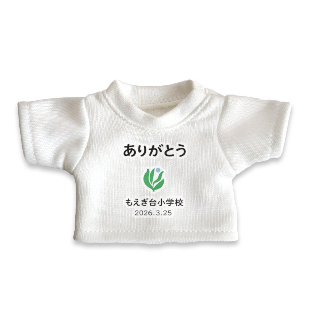 今回、全児童や教職員へと贈られた160個の記念品は、手のひらサイズの可愛らしいテディベアです。着用している小さな白いTシャツの胸元には、もえぎ台小学校の校章と、「ありがとう」「もえぎ台小学校」「2026.3.25」という閉校の日の日付が鮮やかにプリントされています。