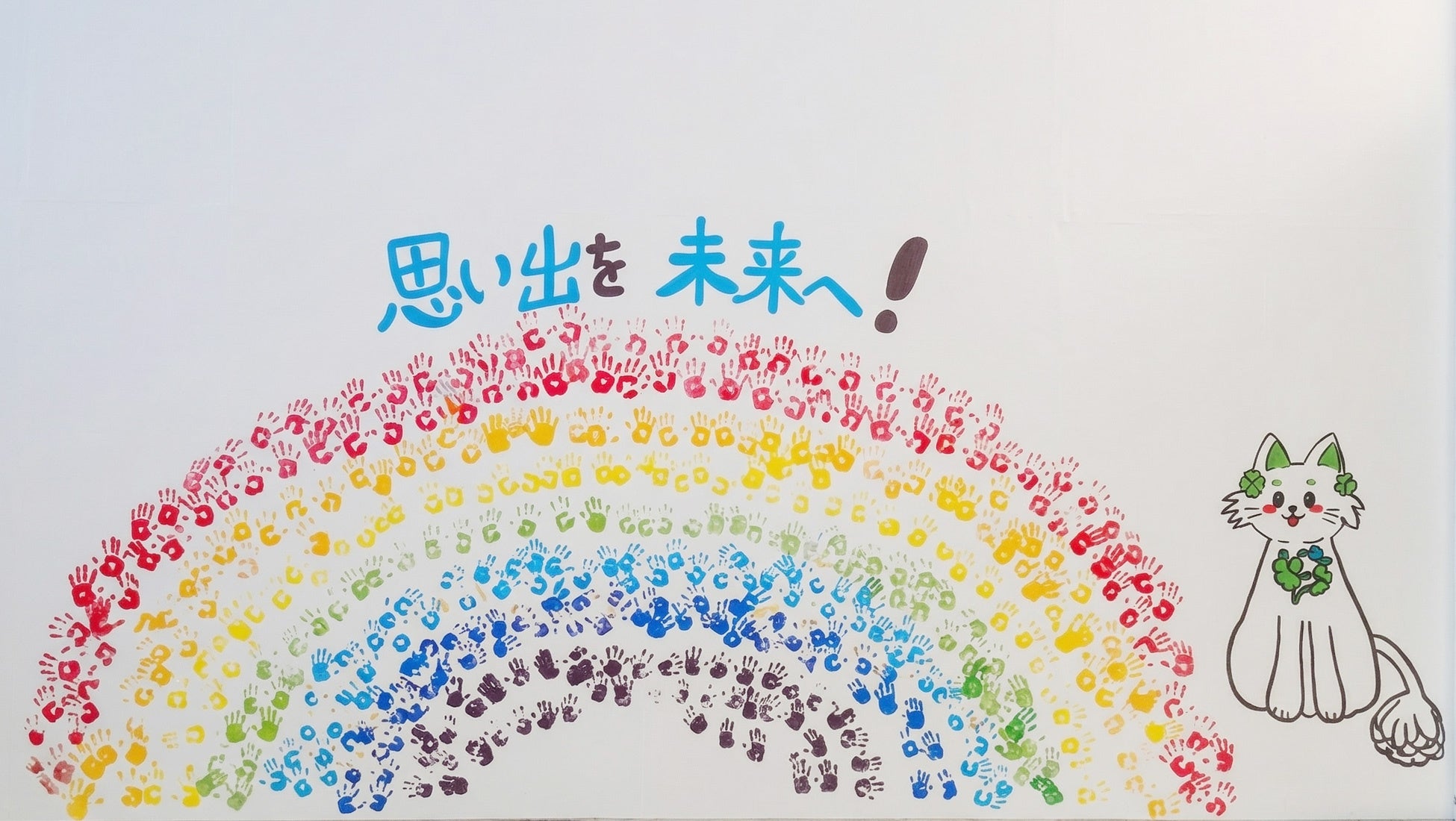 閉校に向けた活動の中で、校内には児童たちの手形で描かれた色鮮やかな大きな虹の壁画が制作されました。そこには、学校のマスコットキャラクター「もえにゃん」とともに、『思い出を未来へ!』という力強いメッセージが記されています。