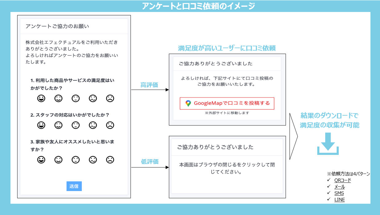 アンケート管理サービスでは、お客様のアンケートの回答の中からより高くご評価をいただいた方に対して、口コミを依頼させていただく機能がございます。その際、ユーザー側ではアンケートの回答の集計結果を確認することができませんでしたが、今回のアップデートにより、集計結果のダウンロードが可能となりました。