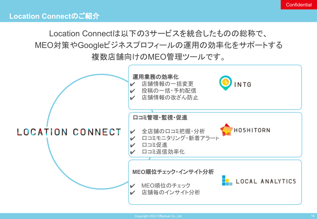 エフェクチュアルが提供する「Location Connect」(ロケーションコネクト)は、個店から複数店舗を展開する企業まで約30,000店舗にご導入頂いている、Googleビジネスプロフィールの運用をDX化するSaaS型クラウドサービスです。