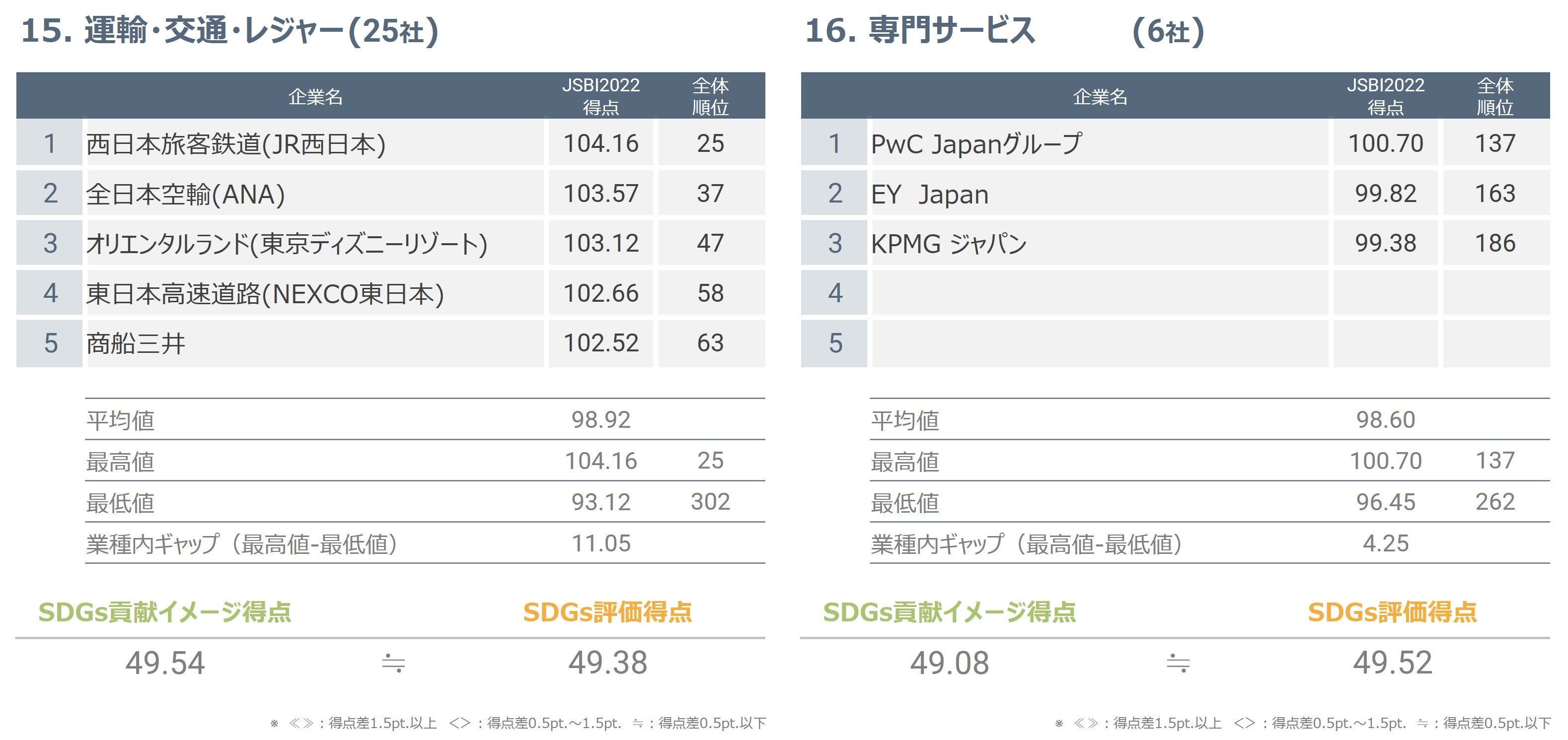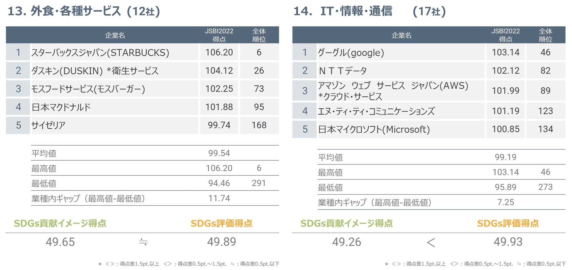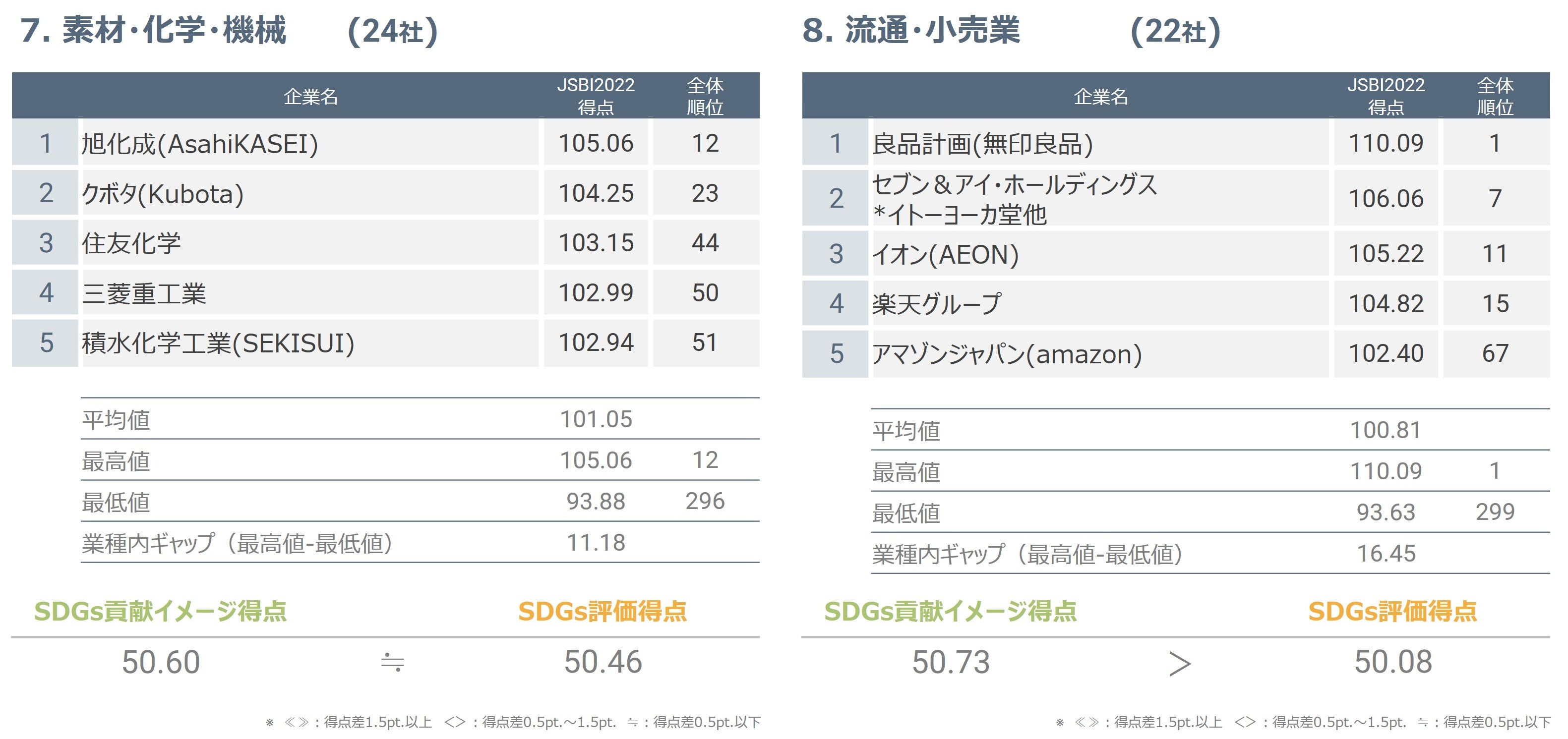 対象12社のうち11社においてJSBI得点が100点を超え、最高位は8位でした。業種内ギャップは7.90と低めであり、この業種は概ね評価が高いという結果が得られました。