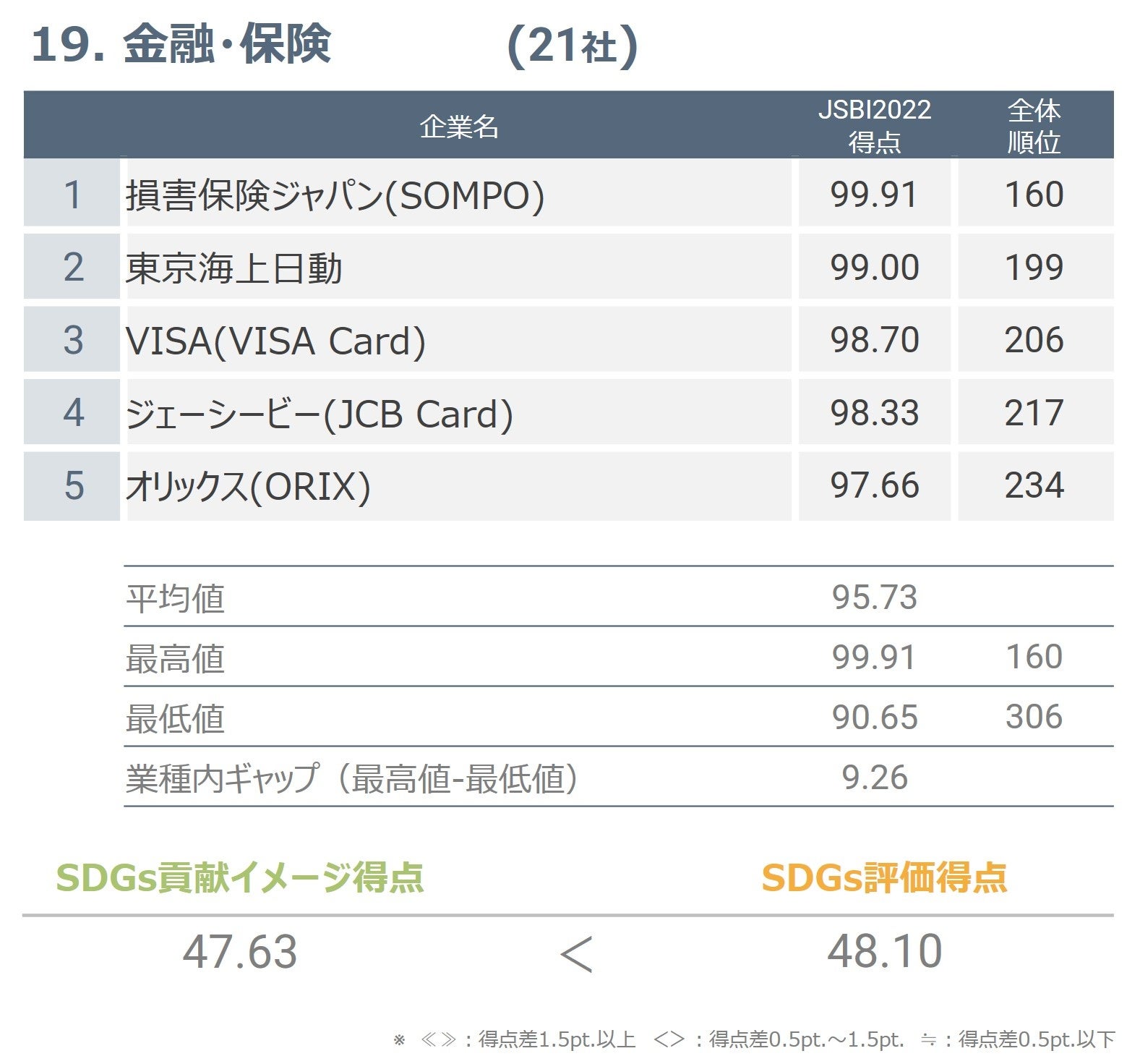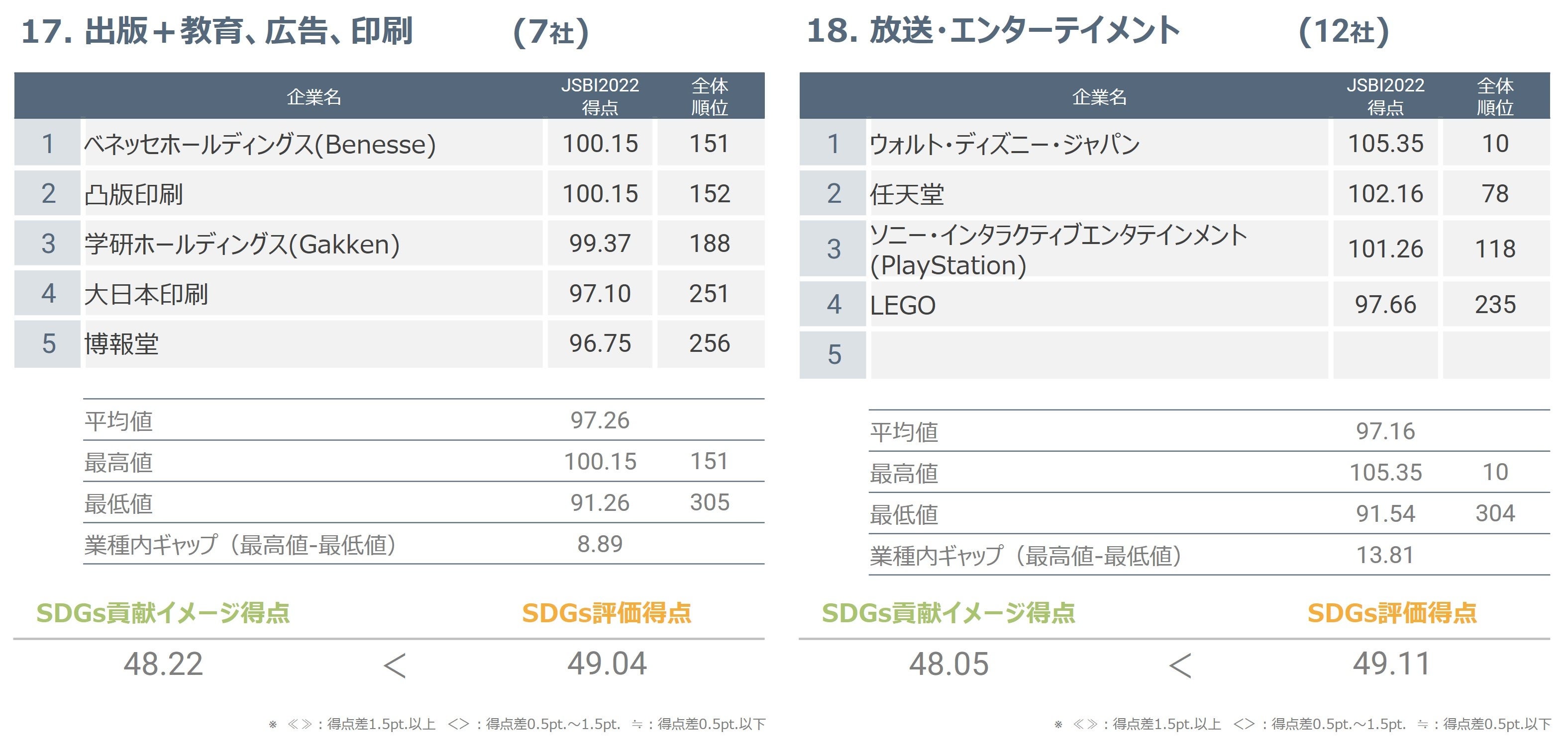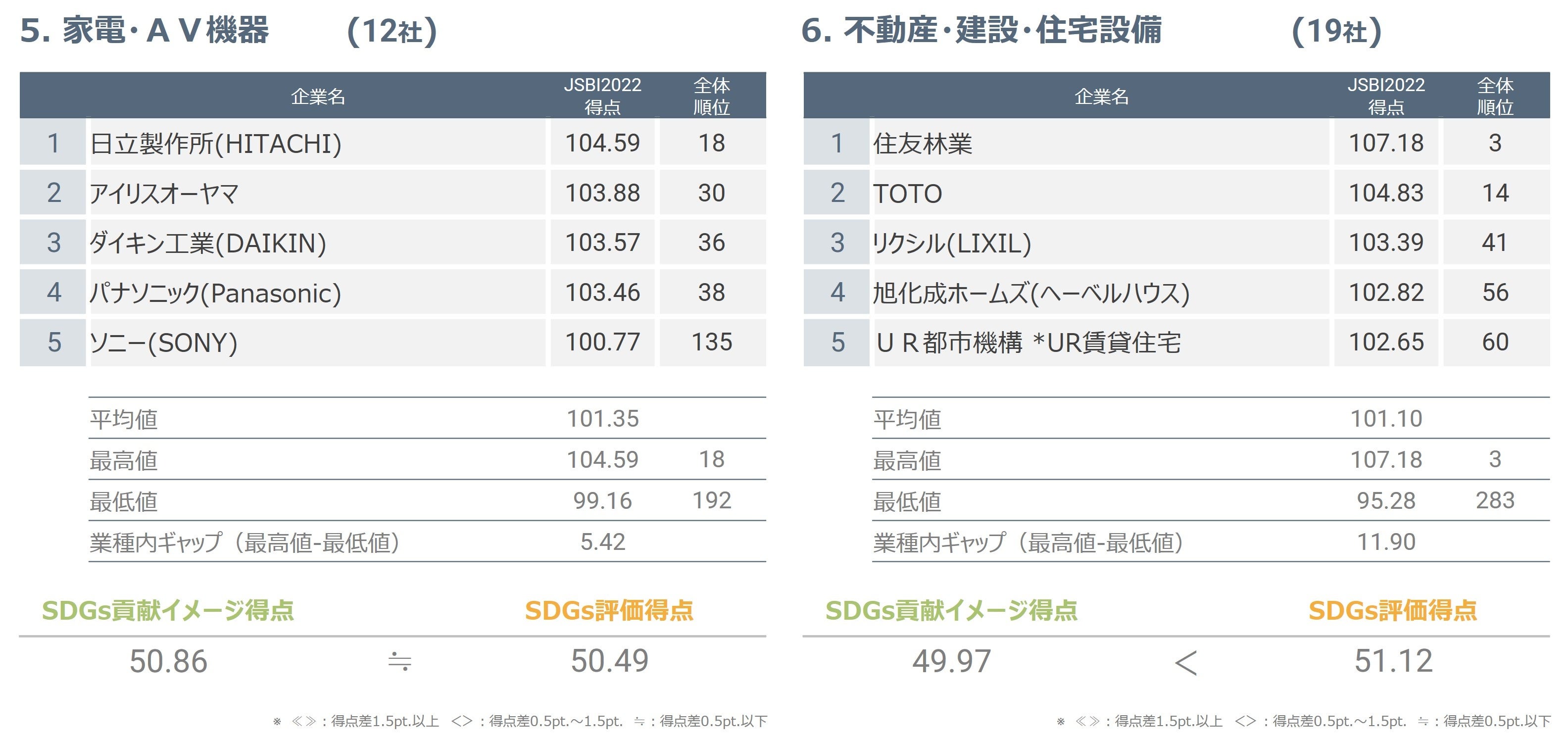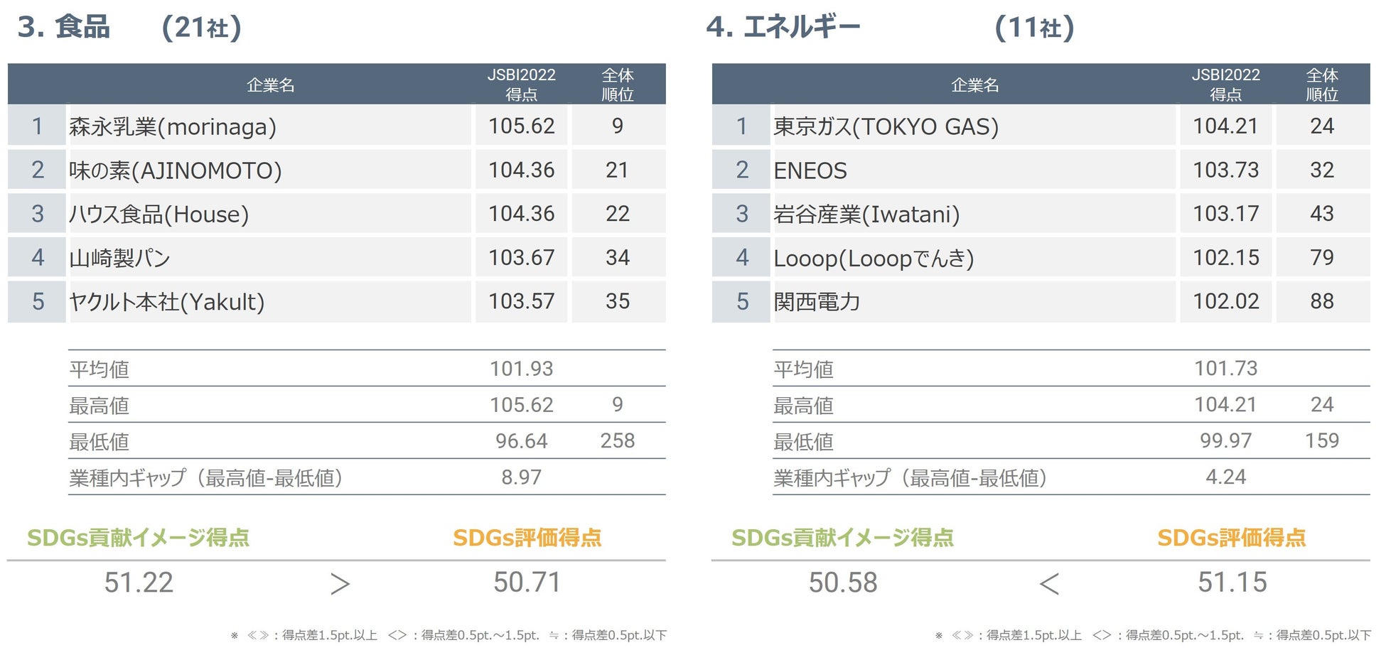 対象12社のうち11社においてJSBI得点が100点を超え、最高位は8位でした。業種内ギャップは7.90と低めであり、この業種は概ね評価が高いという結果が得られました。