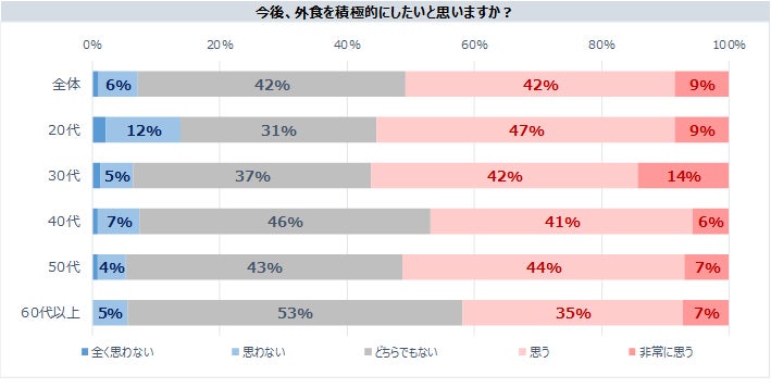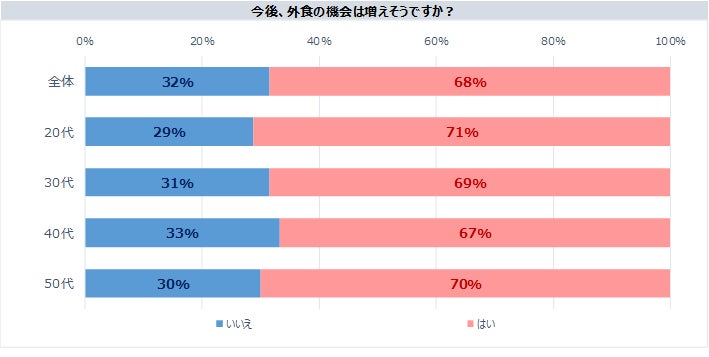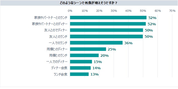 一方、二次会の利用も大きな変化はありませんでしたが利用は9%から11%へ上がっています。半数が今後、外食に積極的に行きたいとしており、68%の方が遊びに行く機会が多くなるので家族や友人との外食が増えそうであるとしています。