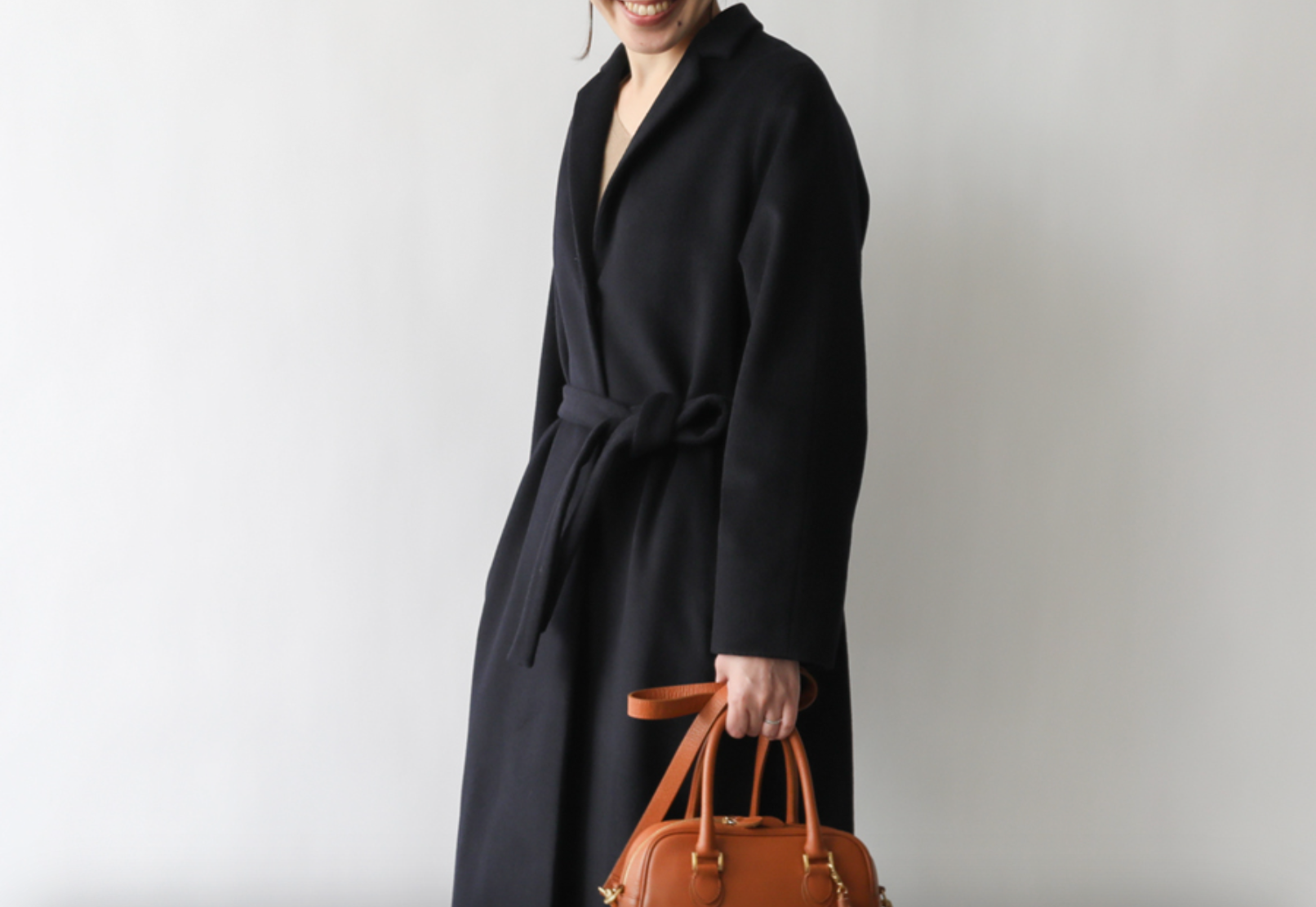 ロングコートは「重たい」イメージがあるかもしれませんが、このコートは生地がとてもやわらかく、羽織ると驚くくらい軽いのが特徴。