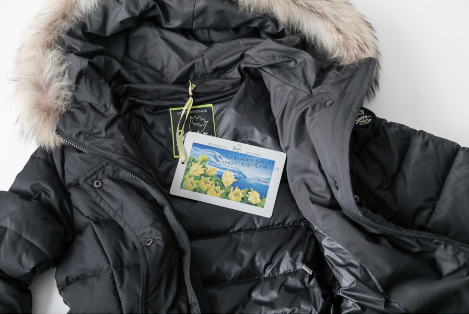 タグに描かれている黄色い花は「ナンキョクミドリナデシコ」という名前の南極大陸に咲く花で、元南極観測隊の女性からのメッセージが添えられています。