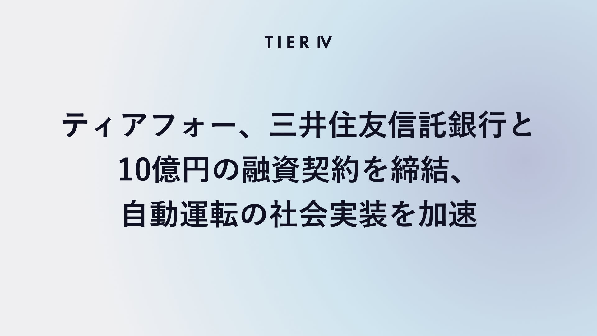 自動運転の社会実装をリードする株式会社ティアフォー(本社:東京都品川区、代表取締役 執行役員 CEO:加藤 真平、以下ティアフォー)は、三井住友信託銀行株式会社(本社:東京都千代田区、取締役社長:大山 一也、以下三井住友信託銀行)と10億円の当座貸越契約を締結しました。