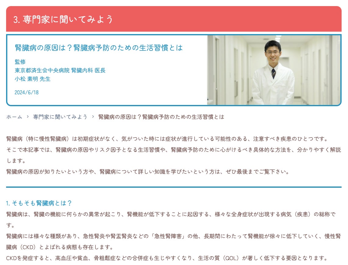 この取り組みにおける第一弾の医療機関として、東京都済生会中央病院の医師へ独自取材を行い、透析や施設に関するより深い情報提供に加え、透析患者収容可能人数や腹膜透析の2023年の症例数実績、医療機関から患者へのメッセージなども掲載しました。今後も賛同医療機関情報の拡大に努めていきます。