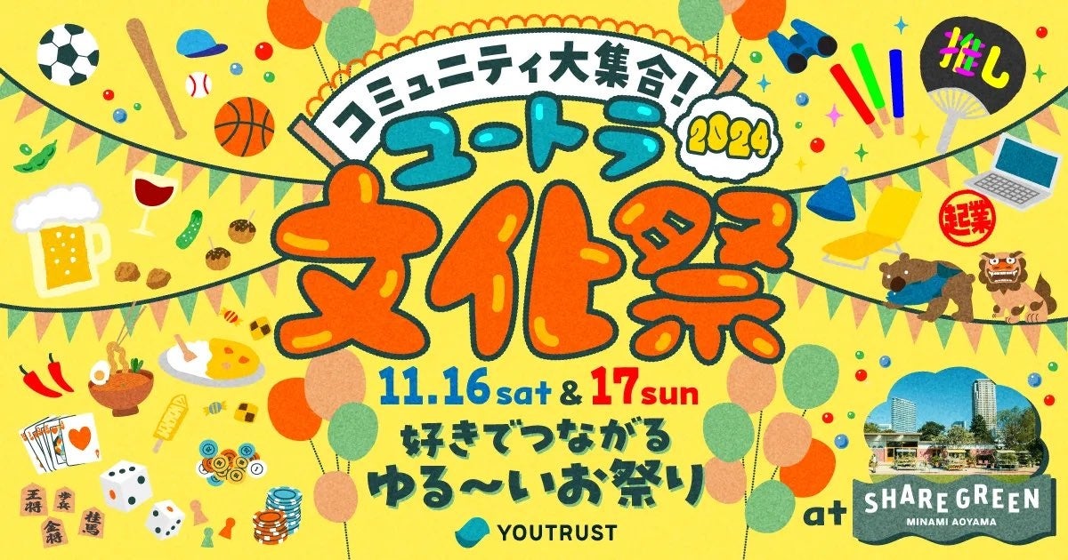 日本のキャリアSNSおよびネットワークリクルーティングサービスの「YOUTRUST」を開発・運営する株式会社YOUTRUST(本社:東京都渋谷区、代表取締役CEO:岩崎由夏)は、会社の垣根を超えた“ゆるいつながり”を提供するイベント「ユートラ文化祭2024」を11月16日(土)・17日(日)の2日間、SHARE GREEN MINAMI AOYAMAにて開催いたします。さらに、特別企画として人気お笑い芸人レイザーラモンHG、髭男爵、AMEMIYA、ひょっこりはんが出演するお笑いライブ「BACK TO THE 青春!」の実施が決定いたしました。
