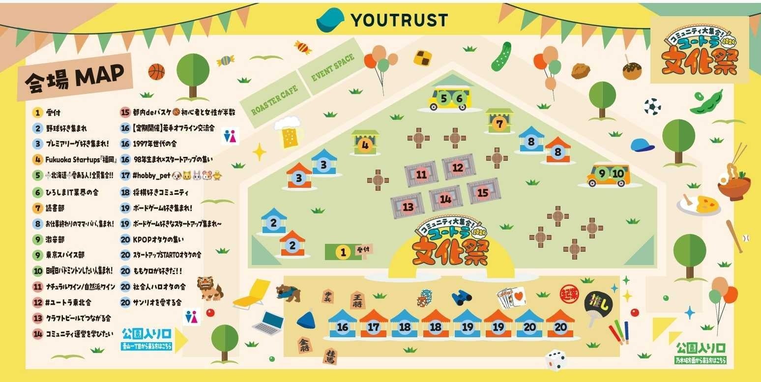 「ユートラ文化祭2024」は、「大人の文化祭」をコンセプトに大人が一丸となって屋台を企画・運営し、会場全体を盛り上げる大規模イベントです。YOUTRUSTのコミュニティ機能「ユートラコミュニティ」の運営オーナーによる20を超える屋台・ブースの出展をはじめ、人気芸人によるお笑いライブ「BACK TO THE 青春!」を開催し会場を盛り上げます。