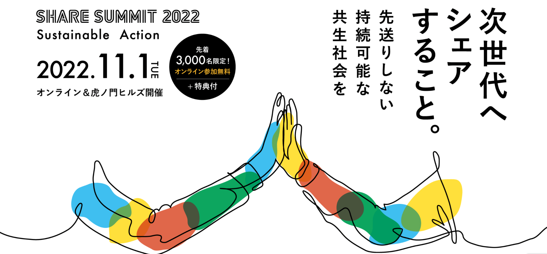 シェアサミットは年に一度のシェアカンファレンスとして、日本経済や消費者のライフスタイルにどう変革をもたらしていくのか。 政府、自治体、企業、個人、あらゆるセクターが集い、毎年のトレンド、世の中の潮流に合わせて共有し学ぶ場として展開しています。今年のテーマは「次世代をシェアすること-先送りしない持続可能な共生社会を-」となりました。