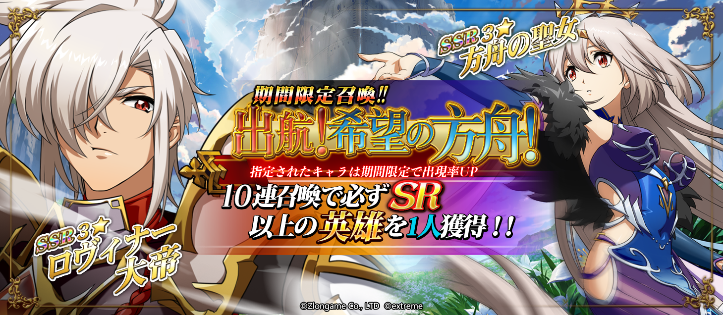 『出航!希望の方舟』は10連召喚で必ずSR以上の英雄を一人獲得できる、期間限定召喚です。SSRロヴィナー大帝、SSR方舟の聖女の出現確率が期間限定でアップします。