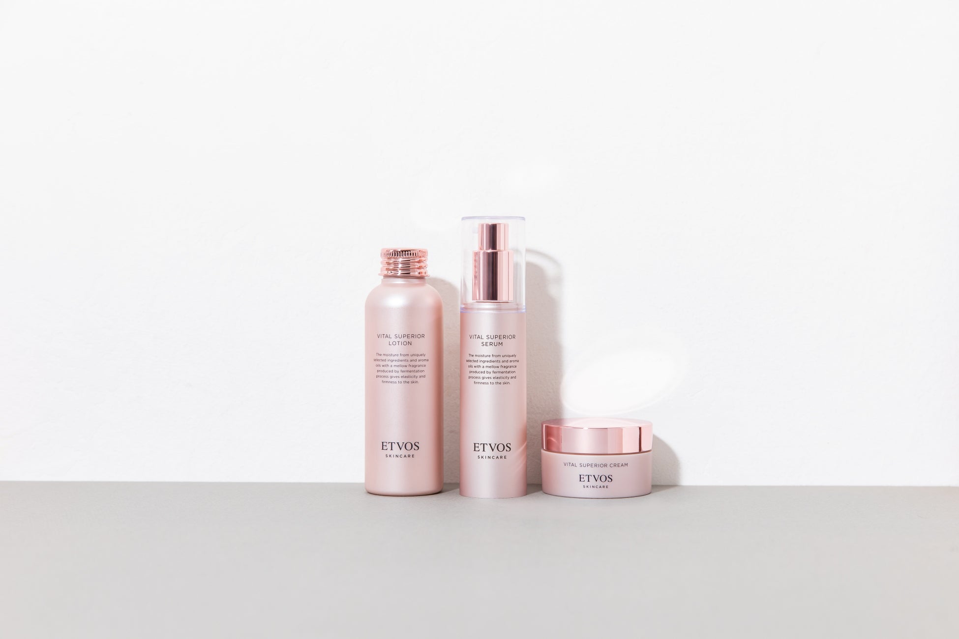 ヴァイタルスペリアラインとは、ETVOS最高峰*スキンケアラインで、保湿成分「ヒト型セラミド」「ナイアシンアミド」「アズキ種子エキス」によりうるおいの満ちた肌に導き、産後の肌を守ります。芳醇な香りを持つアロマオイルにより多幸感が心と全身をすみずみまで満たし、癒しの時間を提供いたします。