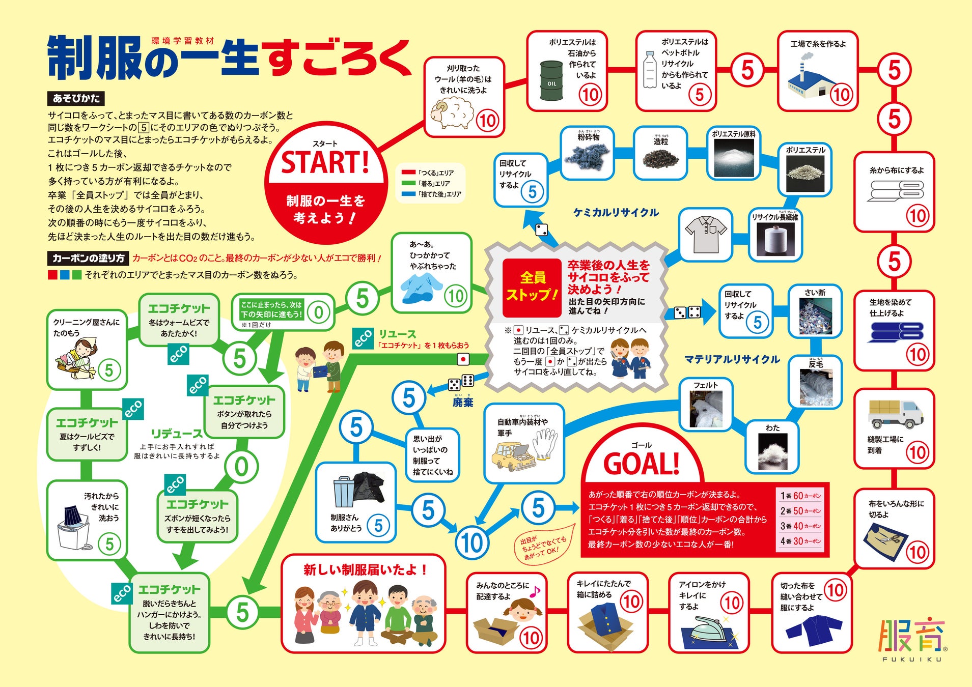 服育学びツールとして多くの学校で取り組んでいただいている「制服の一生すごろく」の体験会です。制服の一生を通して衣服の環境問題や自分達にできることを学ぶことができます。