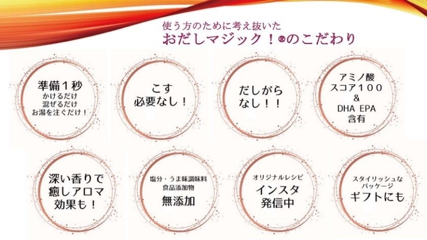 「おだしマジック!®️」は、料理本のアカデミー賞とも称されるグルマン世界料理本大賞日本代表に選ばれた家庭料理研究家・髙窪美穂子が開発した、食塩・うま味調味料・食品添加物無添加の天然だしブランドです。「お湯を注ぐだけ」「こす必要なし」「だしがらなし」という簡便さと「身体によくてちゃんとおいしい」という理念を兼ね備え、“和食”が世界遺産として世界で注目される中、“だし”を通じた新たな料理の可能性を、羽田空港から発信していきます。