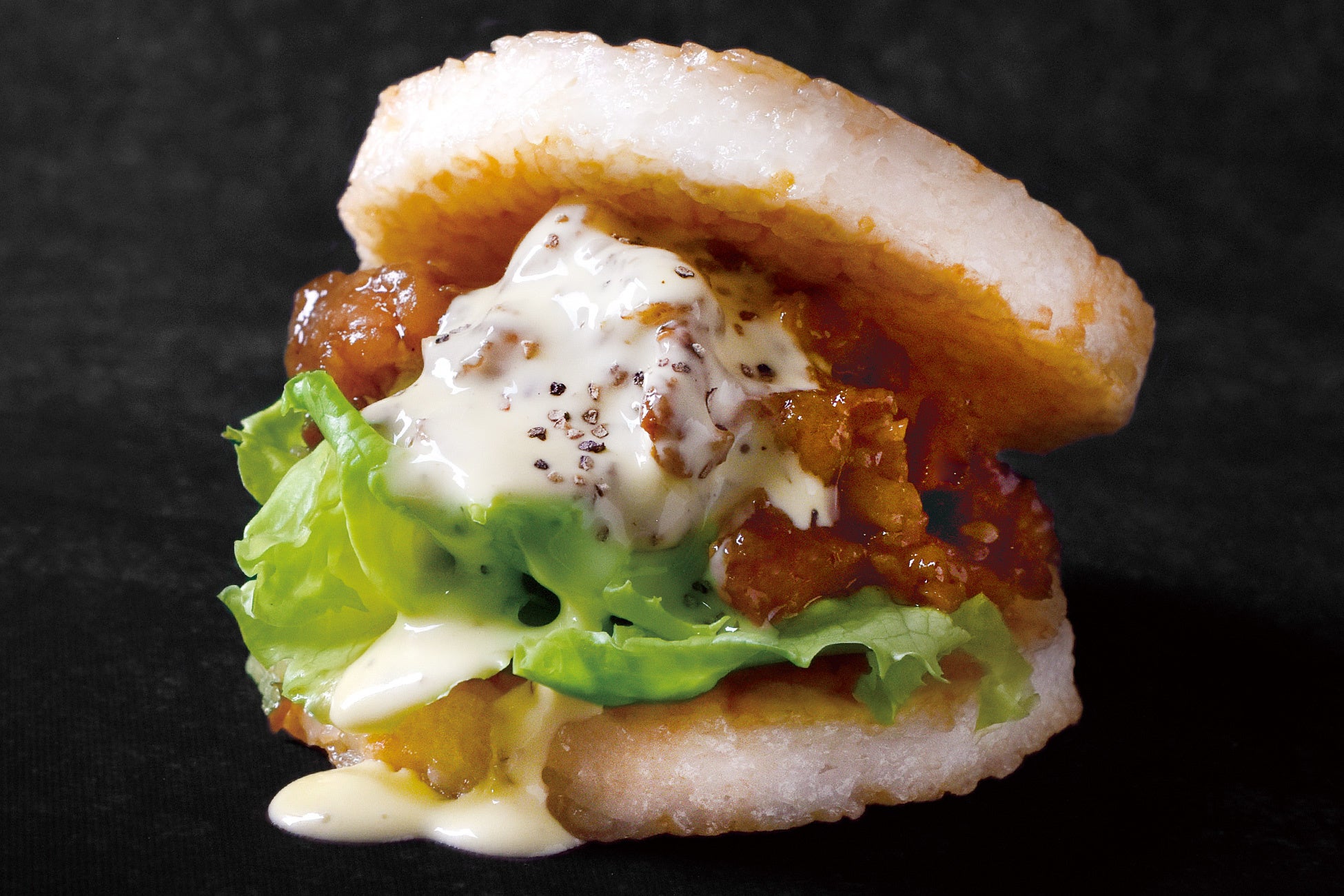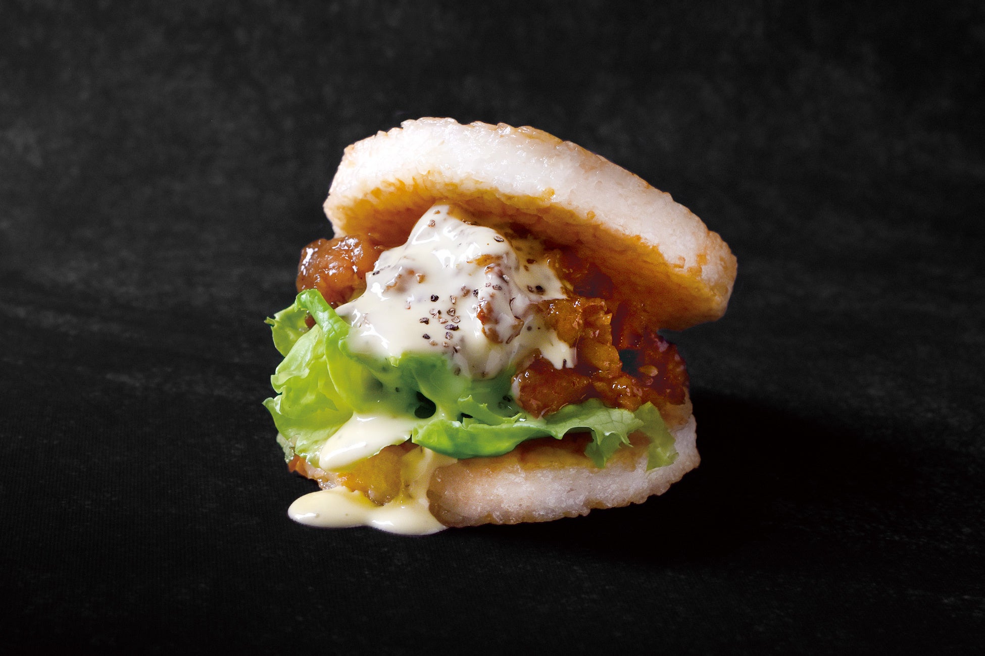 醤油で味付け両面をこんがり焼いた香ばしいライスパテで、炭火香る牛カルビとシャキシャキのレタスをはさみました。卵のコクとうま味が広がるドレッシングは牛カルビの甘辛いタレとも相性抜群で、濃厚でまろやかな味わいです。黒胡椒のアクセントが、味を引き締めています。