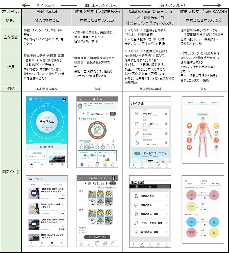 このプラットフォーム上で、PHR管理システム「Smart One Health」(インテグリティ・ヘルスケア)、PHR管理アプリケーション「SaluDi*2」(サワイグループホールディングス)、モバイルアプリケーションサービス「ANA Pocket*3」(ANA X)、「健康支援サービス(健康経営)」および「健康支援サービス(MIRAMED)*4」(日立システムズ)のサービスを提供します。