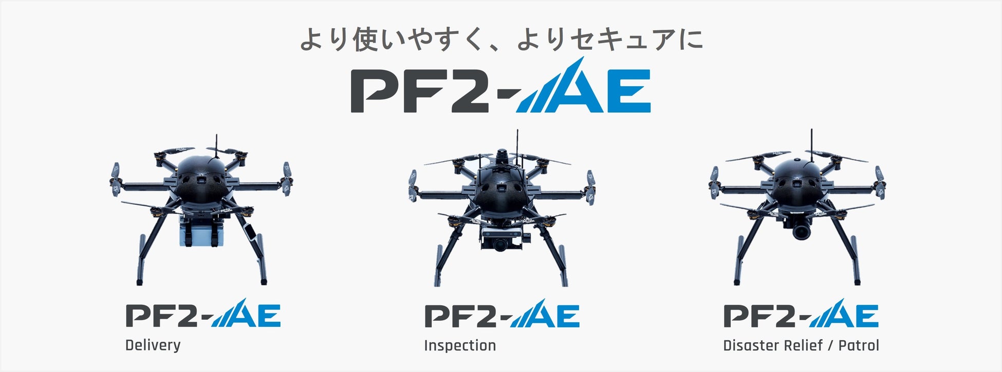 用途別に使いやすくカスタマイズした「PF2-AE Delivery(物流)」「PF2-AE Inspection(インフラ点検)」「PF2-AE Disaster Relief / Patrol(災害/警備)」の3つの機体。SOTEN(蒼天)で開発したセキュアなシステムを搭載し、より進化したドローン。