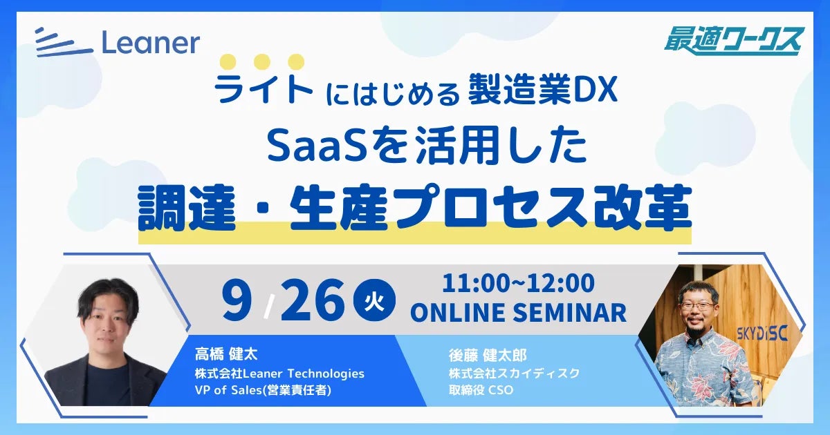 本セミナーでは、SaaSプロダクトを活用することにより、DXを従来のシステム導入プロセスよりも迅速かつスムーズに進める方法に焦点を当てます。調達および見積業務のDXを提供するLeaner Technologiesと、生産計画のDXを提供するスカイディスク社からの先進事例を通じて、この新しいアプローチの潜在的な利点を探求し、製造業におけるDXの可能性について深堀りしてまいります。