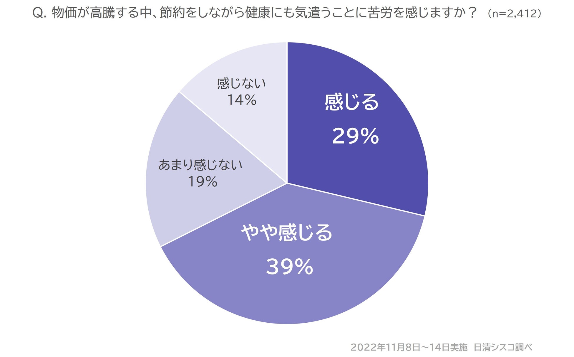 - 物価が高騰する中、節約と健康の両立に苦労を感じている人は約7割