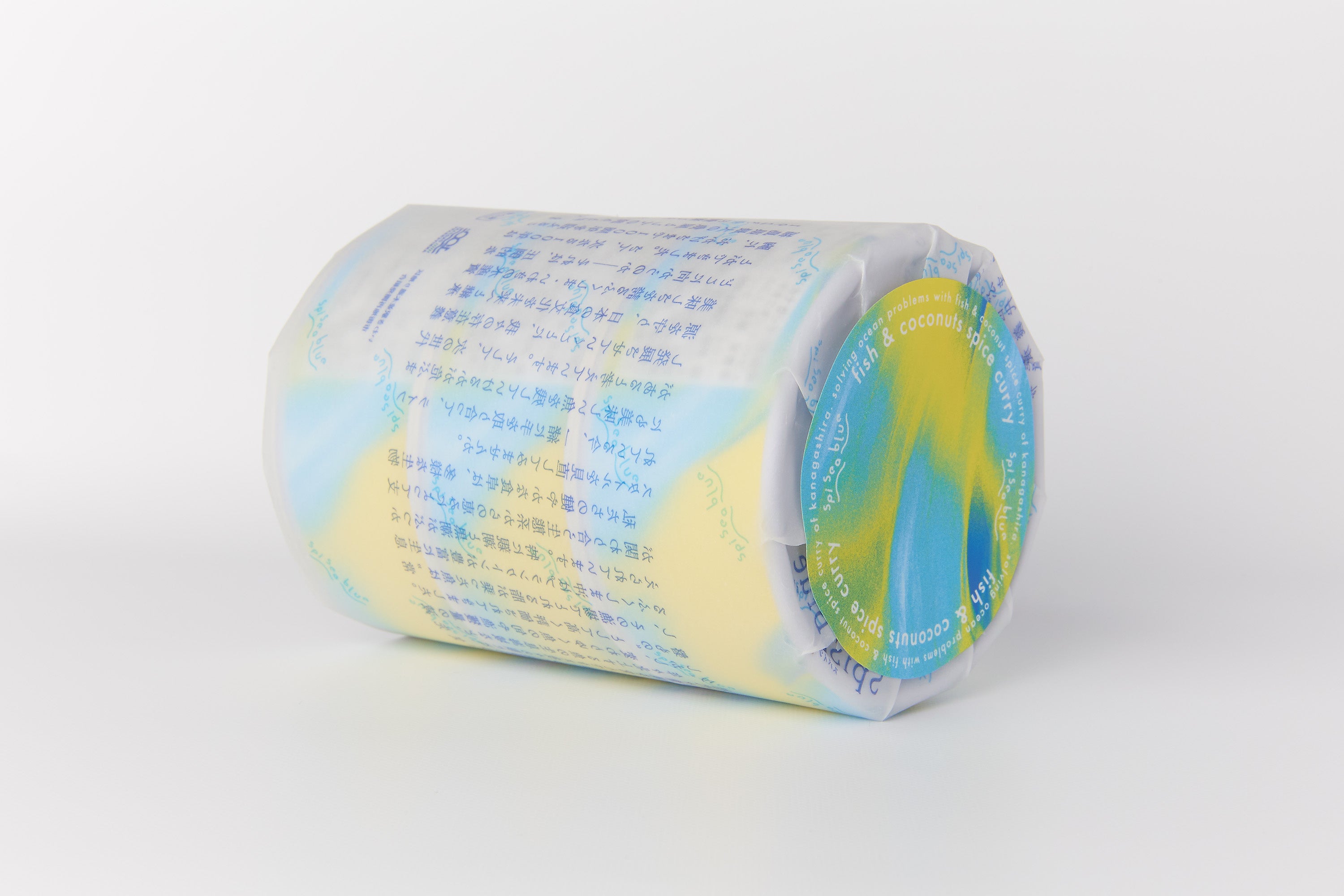 また、パッと目を引く芸術的なパッケージデザインも力を入れて作りました。未来に向かって力強く進む福島の輝きと、街を支える海の色をイメージして制作され、ギフトにも喜ばれる洗練されたカラーリングとなっています。重ねた3つの缶詰を包むのは一般的なプラスチック包装ではなく、缶詰に施された美しい色彩を生かすことができるトレーシングペーパーです。そしてこの紙には、小野崎の地球と次世代への思いが綴られています。