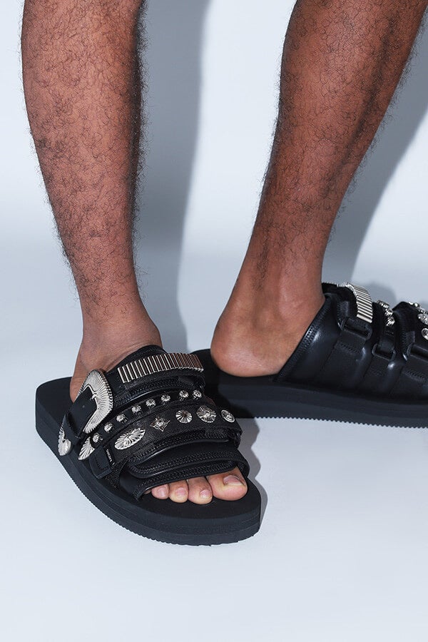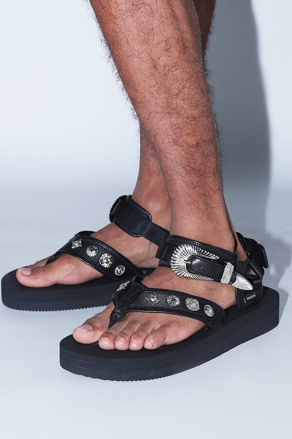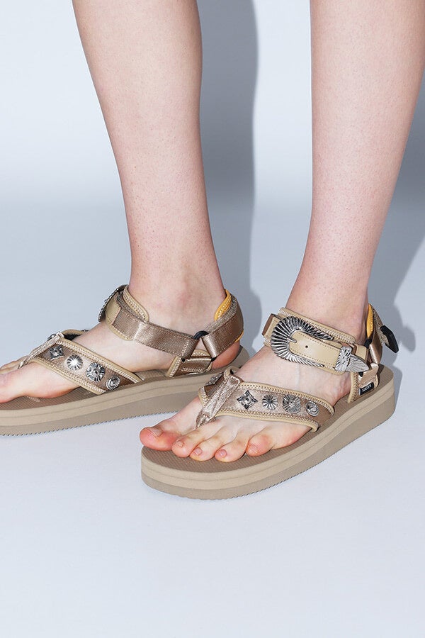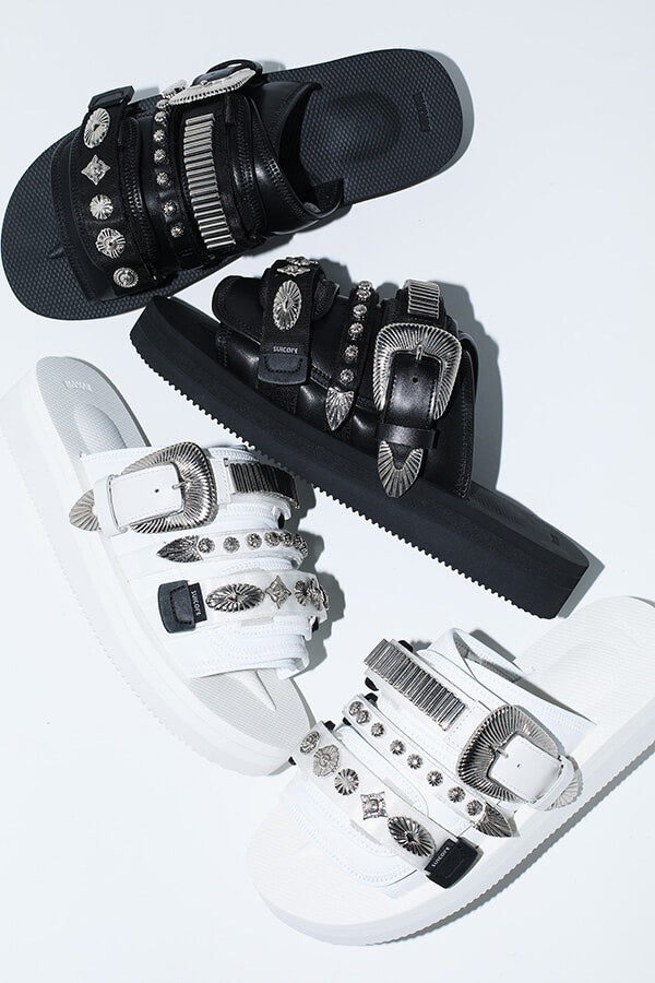 SUICOKEとTOGAの約2年ぶりとなるコラボレーション。第4弾となる今シーズンでは、トング型とアッパーに様々なメタルパーツをあしらった2型のサンダルが登場。