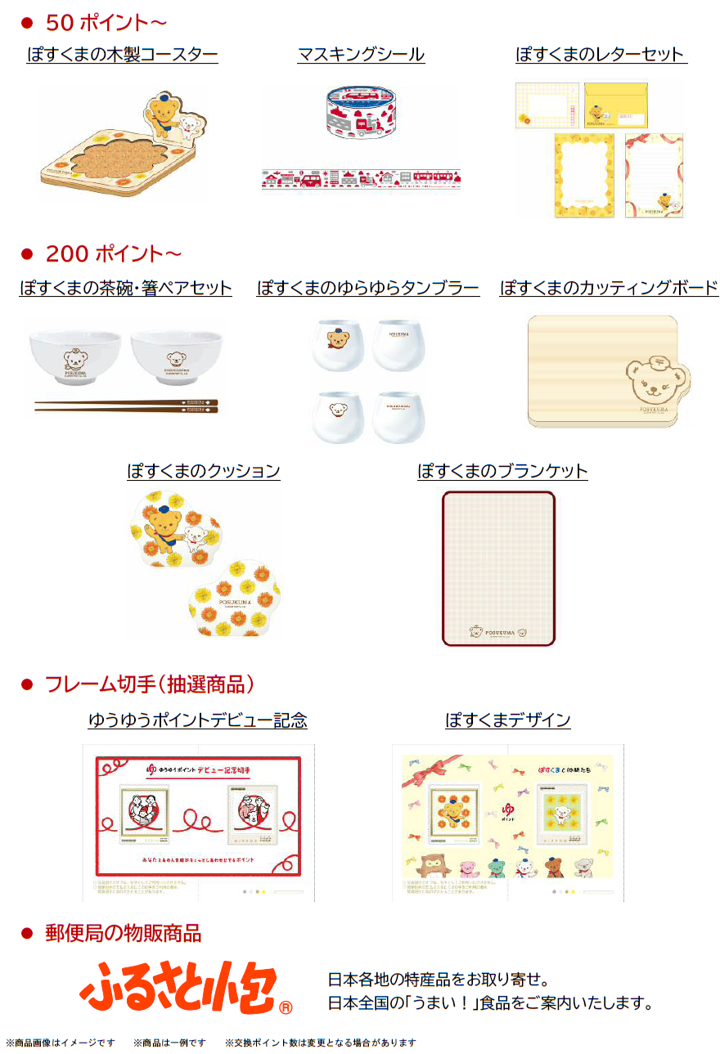 使える | ゆうゆうポイントサイトで、郵便局ならではの限定商品との交換や抽せんの応募にご利用いただけます。 今後、貯めたポイントでの商品購入やサービス代金の支払にもご利用いただけるよう順次拡大していきます。 [ゆうゆうポイントサイト:https://site.jppt.pf.japanpost.jp/] 【限定商品】(50~1,000ポイント) ・ぽすくまのレターセットやブランケット ・ゆうゆうポイントデビュー記念 限定フレーム切手 ・郵便局オリジナルマスキングテープ など 【大切な人との時間を豊かにする商品】(400~40,000ポイント) ・ぽすくまの茶碗・箸ペアセット ・海外有名ブランドのコーヒーメーカー ・国内有名ブランドのポータブルスピーカー ・国内外人気ブランドのキャンプ用品 ・有名ベビーブランドのテーブルウエアセット など |