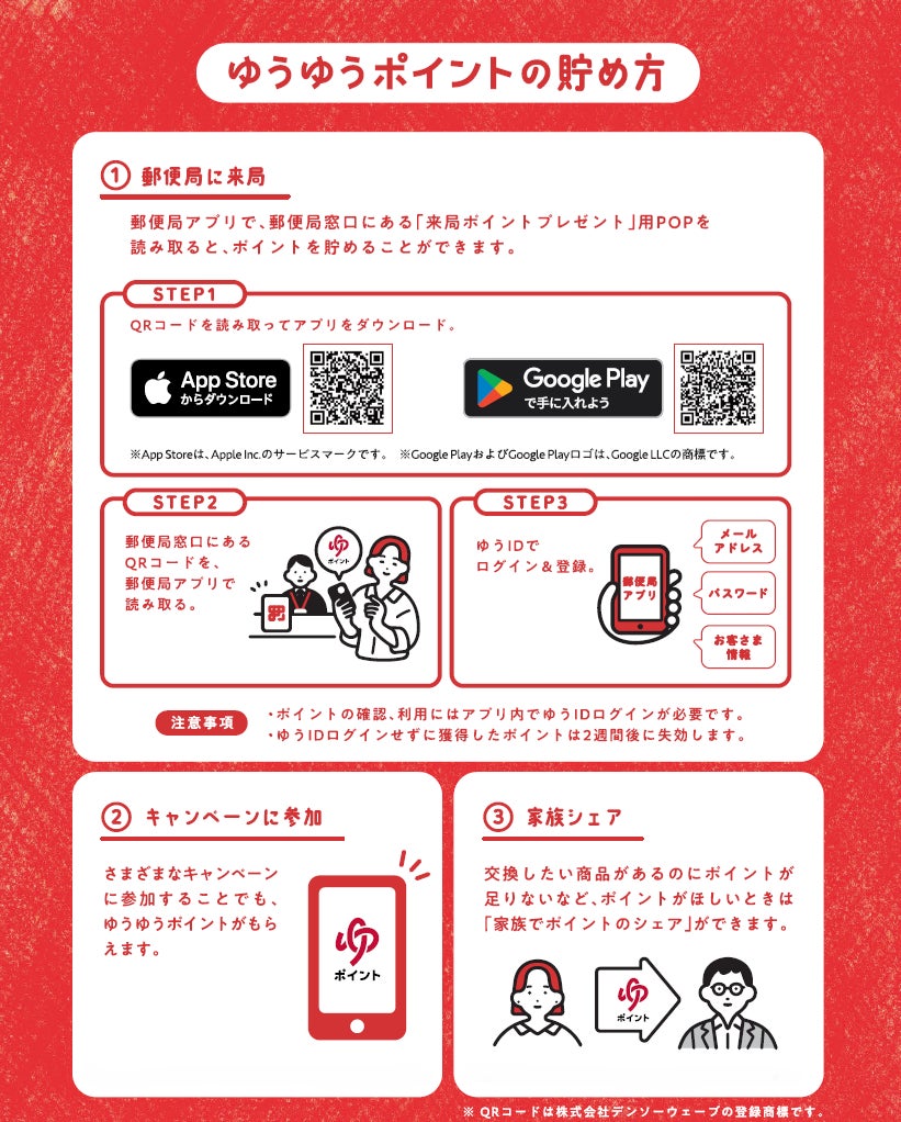 今回サービスを開始するゆうゆうポイントは、郵便局への来局などにより手軽に貯めることができます。貯まったポイントは、郵便局ならではの限定商品や大切な人とつながりを深める商品との交換および抽せん、家族へのシェアなどにご利用いただけます。