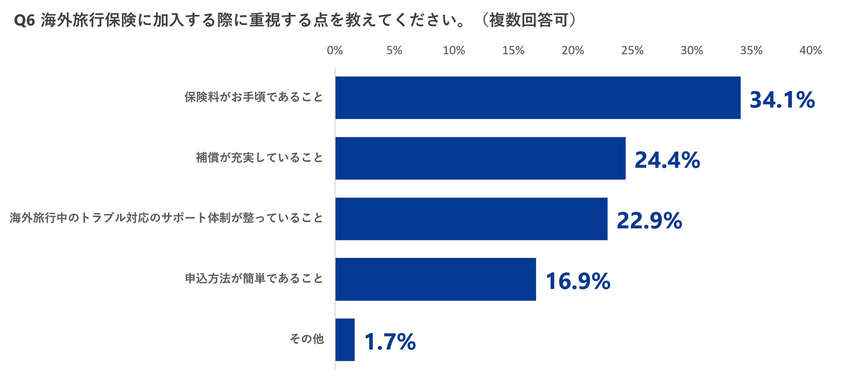 6.海外旅行保険を検討する際に、最も重視することは「保険料がお手頃であること」が34.1%。次いで「補償が充実していること」が24.4%。