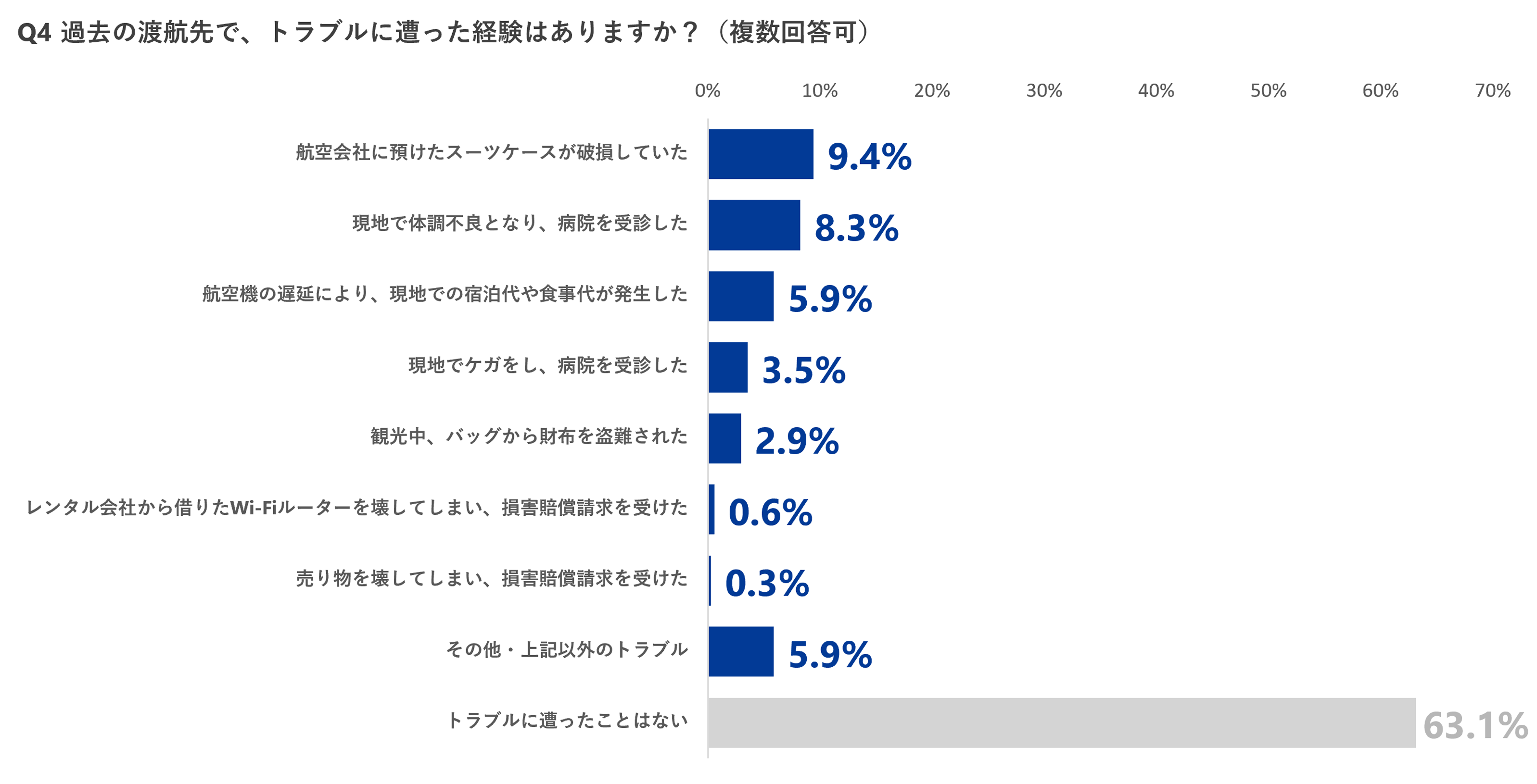 過去の渡航先で「トラブルに遭ったことはない」と答えた方を除くと、「航空会社に預けたスーツケースが破損していた」と答えた方が9.4%と最も多く、次いで「現地で体調不良となり、病院を受診した」と答えた方が8.3%となりました。