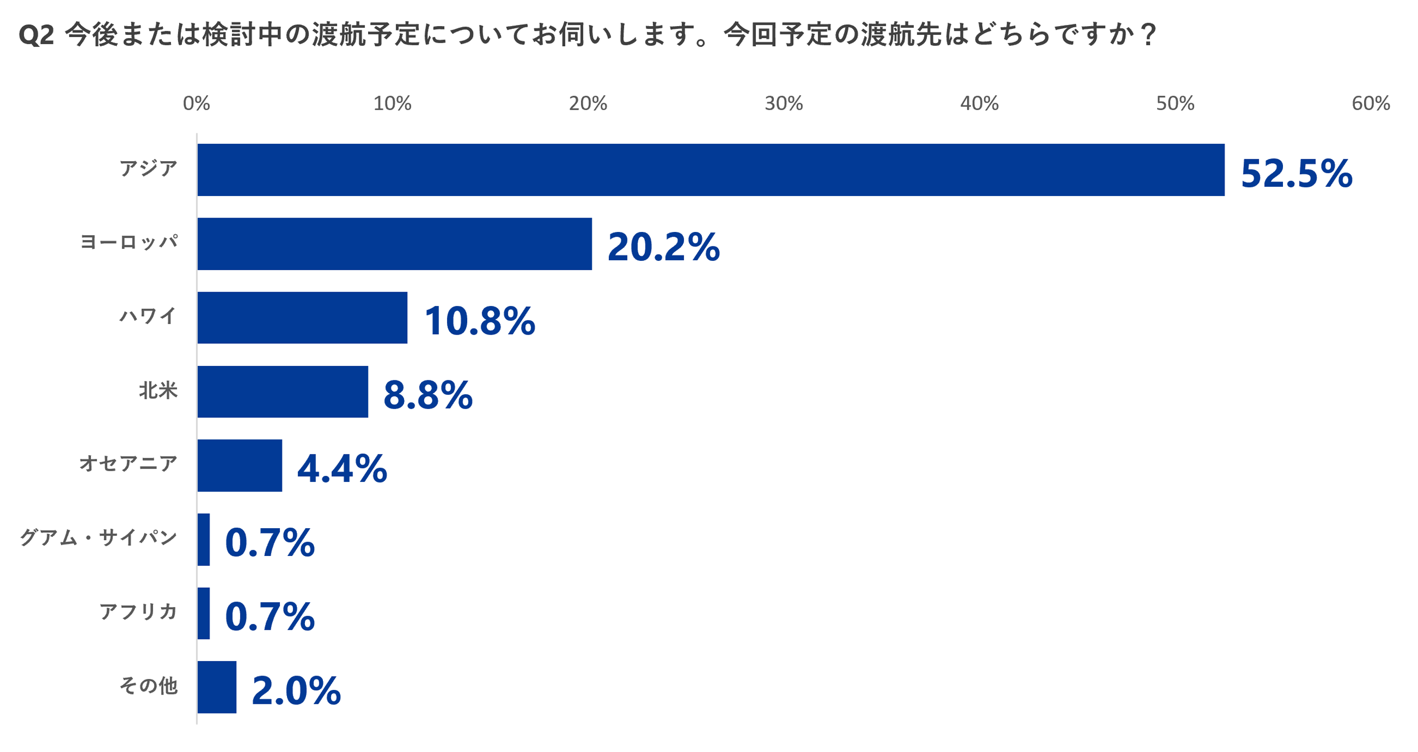 今後予定している、または検討中の渡航先について最も多いエリアは52.5%で「アジア」(韓国、台湾、香港、中国、タイなど)となりました。次いで「ヨーロッパ」(チェコ、イタリア、ドイツなど)が20.2%となりました。