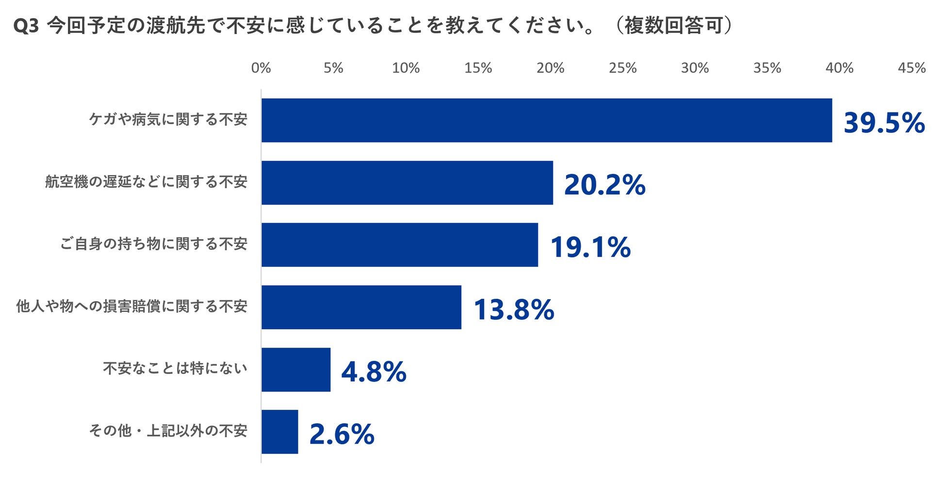 渡航先での「ケガや病気に関する不安」を抱える方が39.5%と最多。次いで「航空機の遅延などに関する不安」