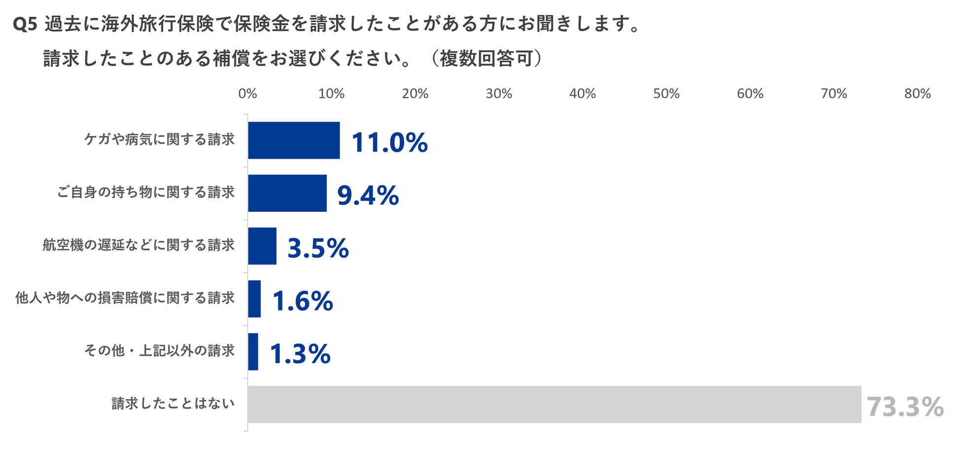 5.過去の渡航先でのトラブルで、請求したことのある補償は「ケガや病気に関する補償」が11.0%と最多。