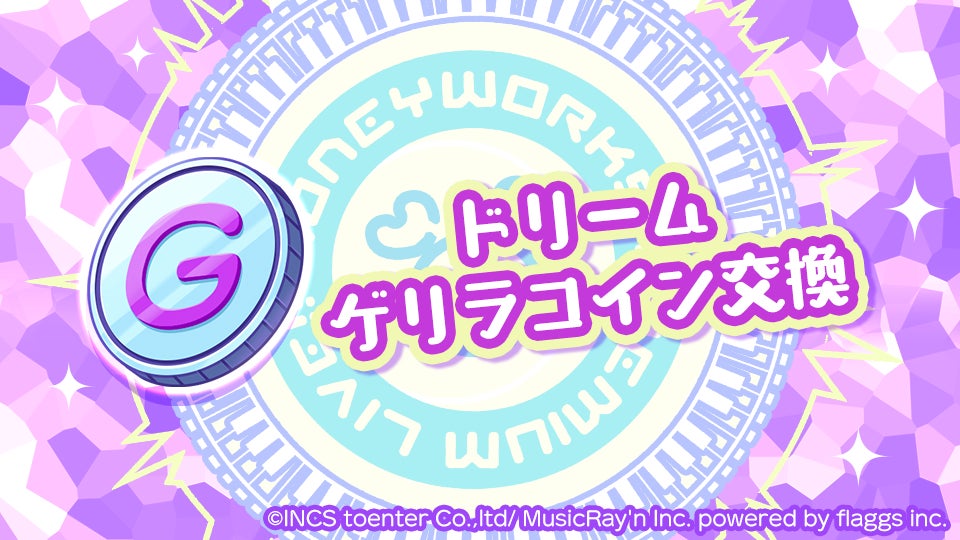 2023年1月8日(日)15:00より、ゲリラライブ専用楽曲をクリアすることで手に入る「ドリームゲリラコイン」を、好きなアイテムと交換することができる『ドリームゲリラコイン交換所』が開催中です。この機会にぜひ交換所をご利用ください。