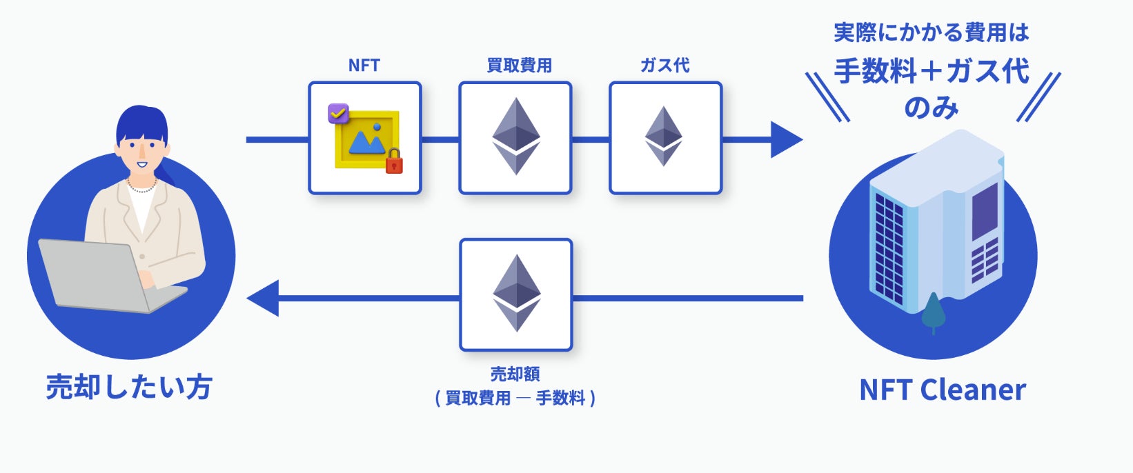 NFT Cleaner(α版 )は、Ethereum上でNFTをスマートコントラクトにて自動で買い取るウォレットの整理整頓サービスです。市況の悪化などの影響で不良資産化したNFTを「手数料+ガス代」のみで売却できるため、年末のウォレット整理にご活用いただけます。