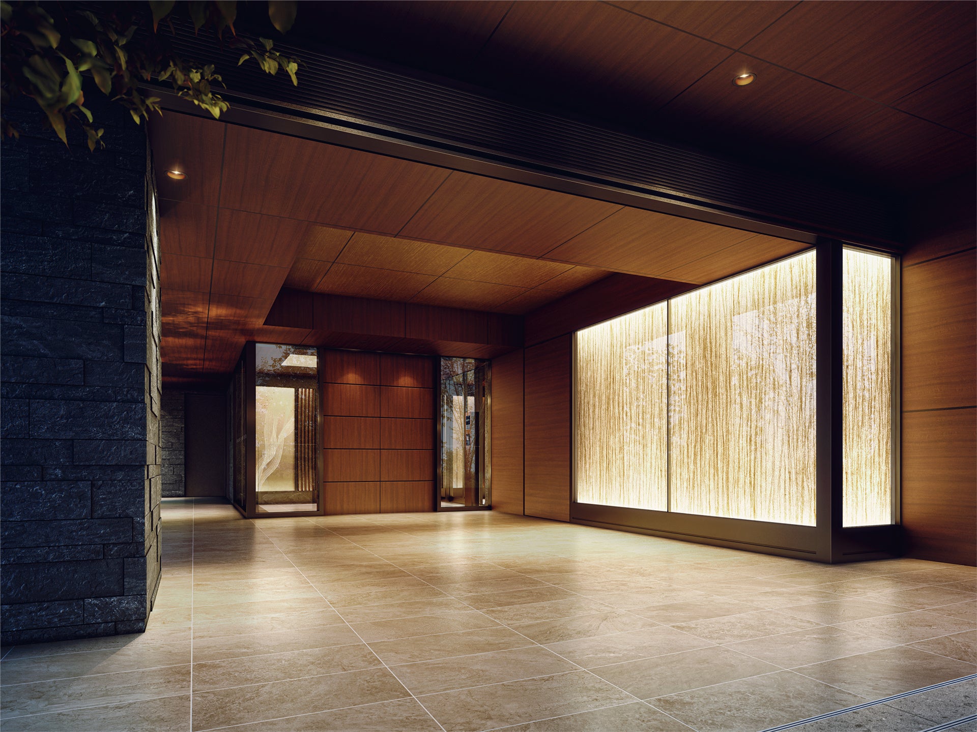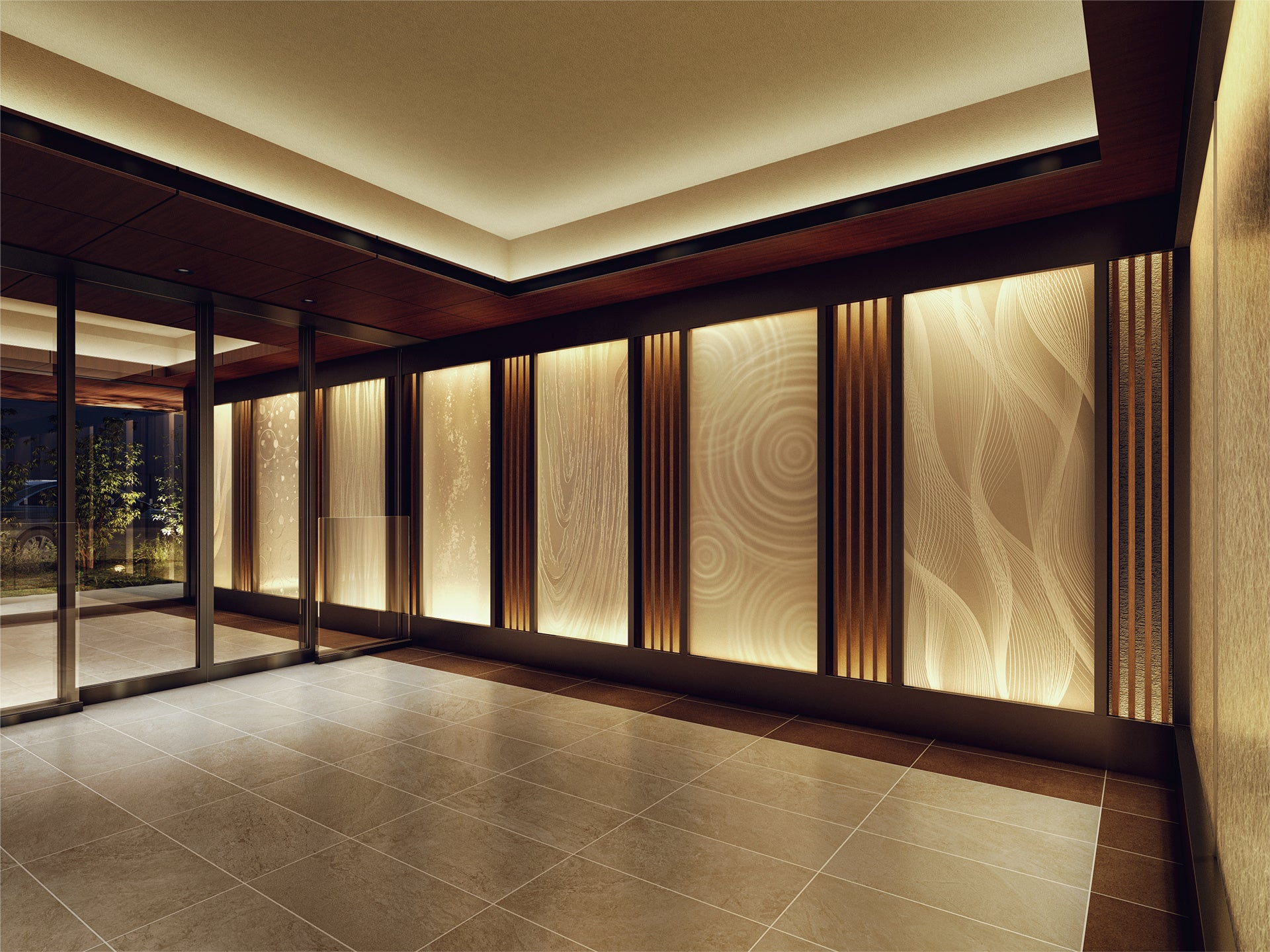 エントランスから風除室、エントランスホールにかけては、自然をモチーフとしたデザインガラスの壁面を設えました。間接照明によって美しい模様が浮かび上がります。屋外の自然につつまれた趣を邸宅の内側へとつなぐ動線であり、アート作品が並ぶギャラリーのような空間です。