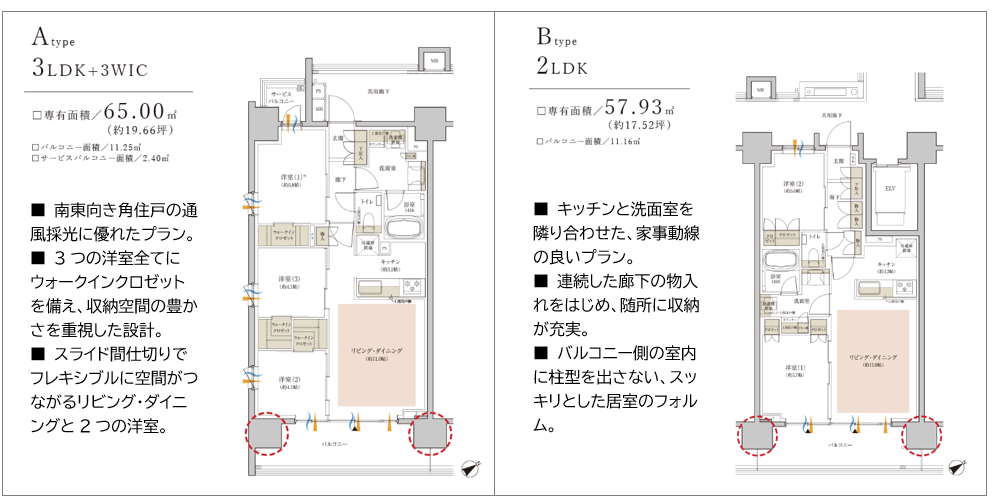 住戸の独立性、プライバシー性に配慮し、1フロア3邸でレイアウトしました。住戸の間取りは、通風・採光に優れた角住戸中心の2LDK・3LDK(専有面積57.93㎡・65㎡)の3タイプを用意しています。室内は、バルコニー側の柱型を外に出したアウトフレーム設計で、家具を配置しやすい、すっきりとした空間です。上層階からは、都心部の眺望を望むことができ、開放感あふれる視界が広がります。