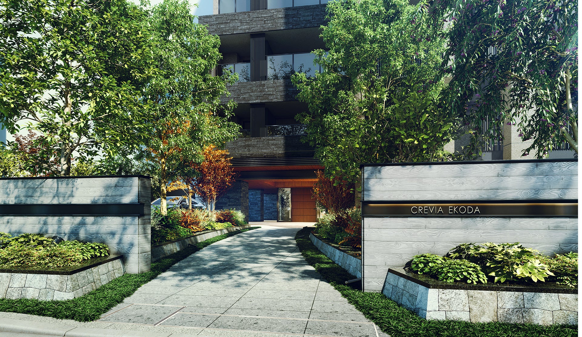 本物件は、駅前の賑わう街並みから一歩入った一角に位置しており、通りからエントランス前までは緑豊かな庭園を設え、木立の間をぬける散策路のようなアプローチを設けました。通りから奥まった位置に建物を配置することで、駅近立地でありながら心地よい静けさとやすらぎを感じる空間としました。