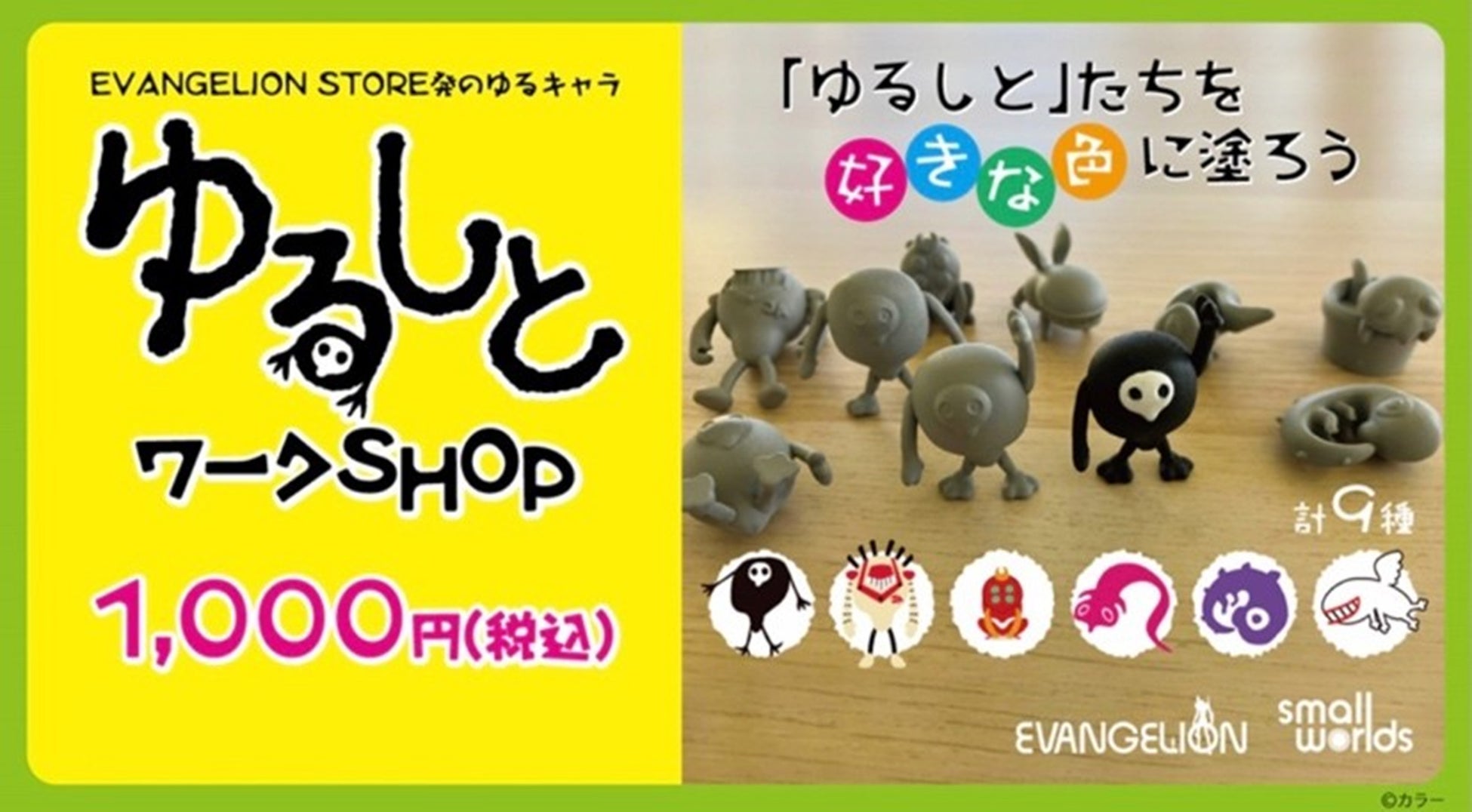 「EVANGELION STORE」のマスコットキャラクター「ゆるしと」のフィギュア9種類から選んで、アクリル絵具と筆を使って自由な色塗り体験ができるワークショップです。1,000円(税込)、約30分〜60分、3階ワークショップエリアで開催します。