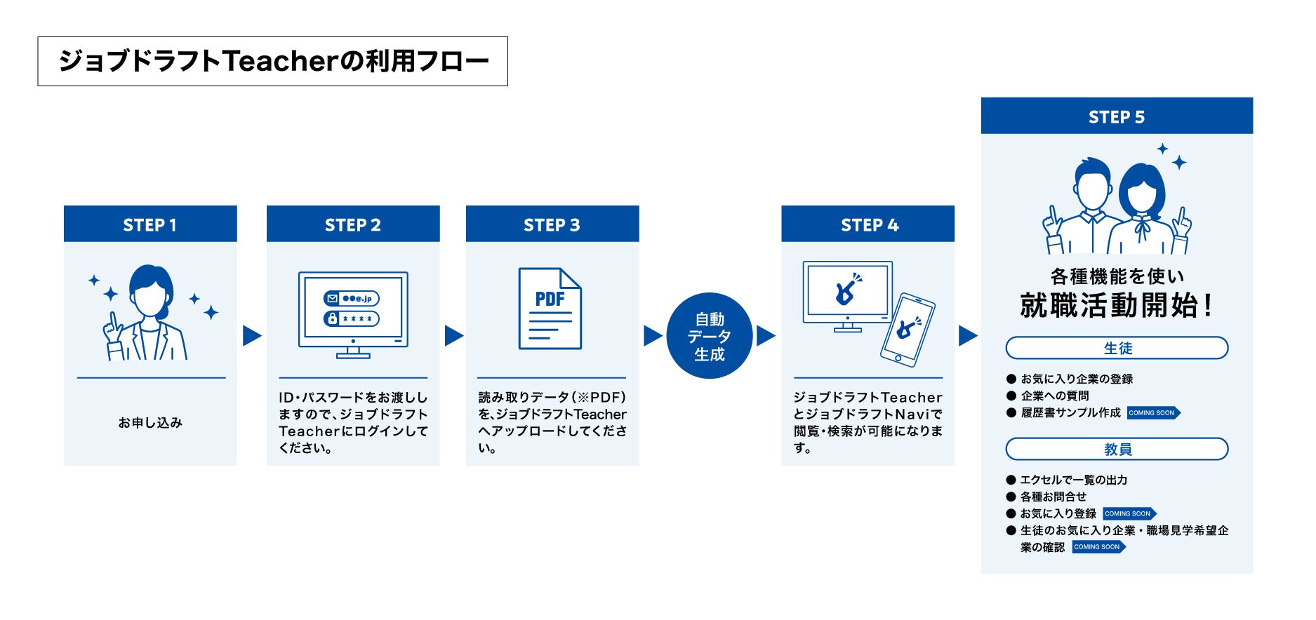 ・生徒の就職活動に特化した求人情報アプリ「ジョブドラフトNavi」がご利用いただけます。