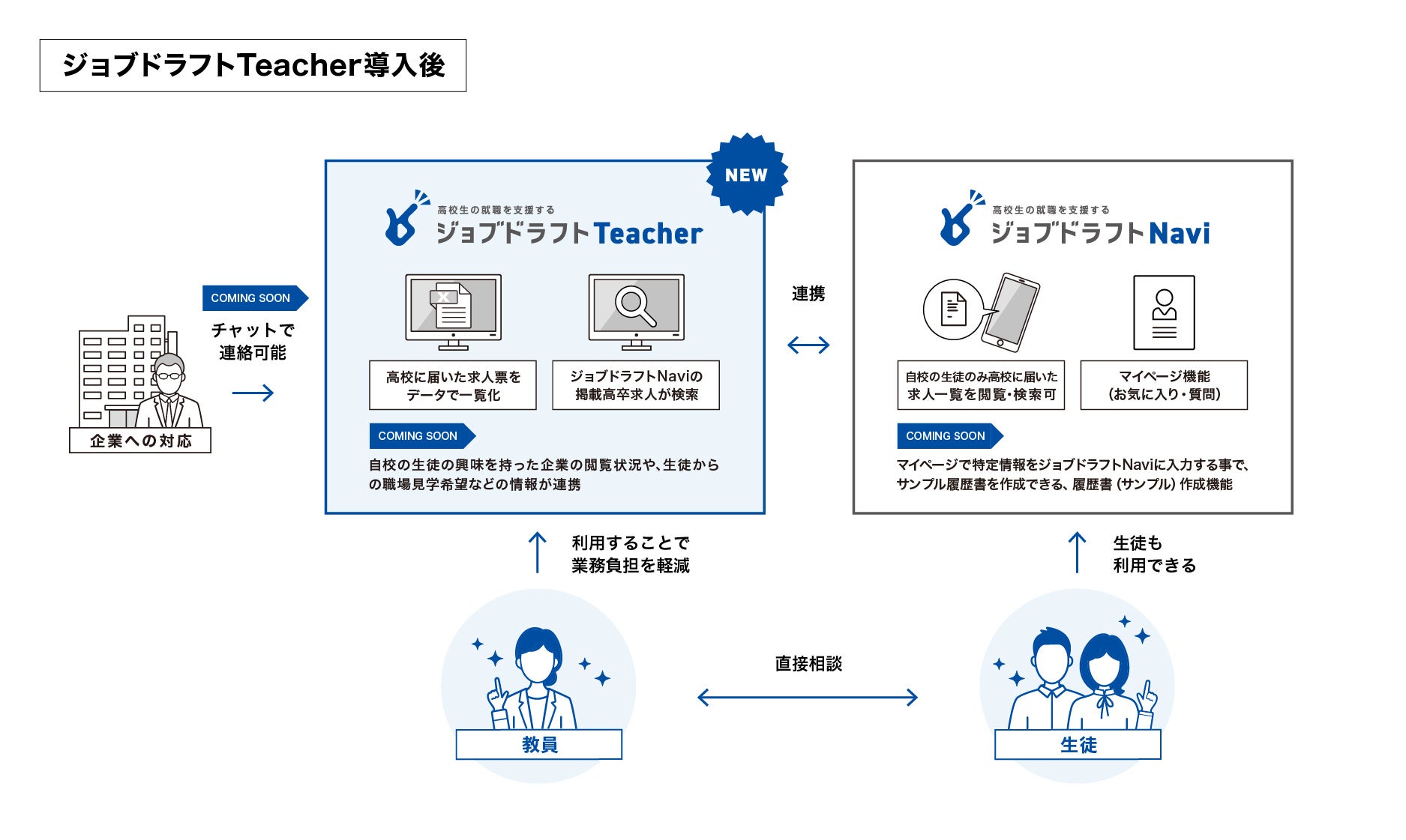 「ジョブドラフトTeacher」と「ジョブドラフトNavi」をご活用いただくことで、先生・生徒・企業にとって出会いの機会を増やし、ミスマッチの軽減を目指します。