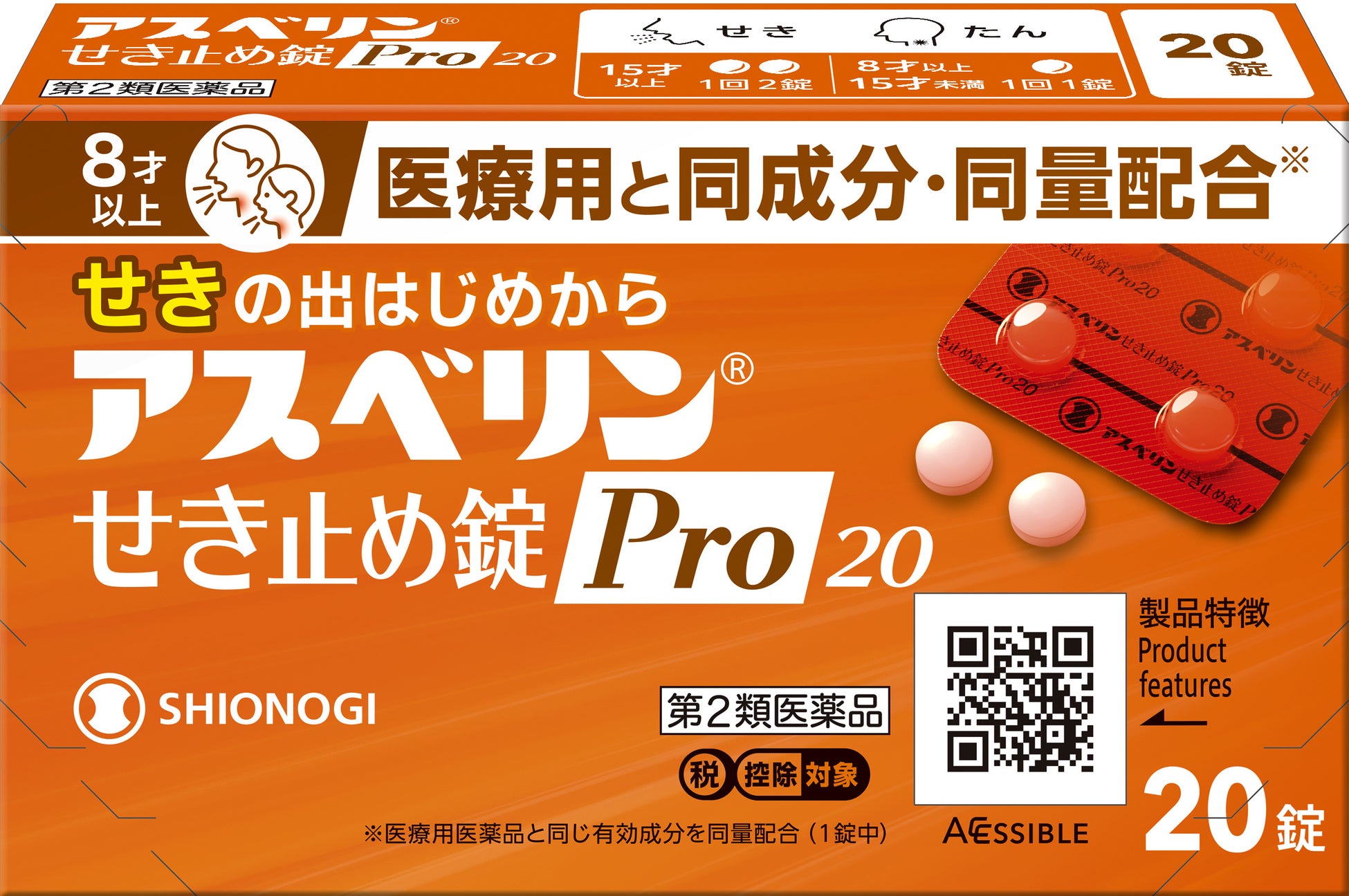 「アスベリンⓇせき止め錠Pro20」はせきをしずめるとともに、たんを出しやすくするチペピジンヒベンズ酸塩を医療用と同量配合※4したせき止め薬です。8才のお子さまから大人まで服用いただけるため、常備薬としてもおすすめです。