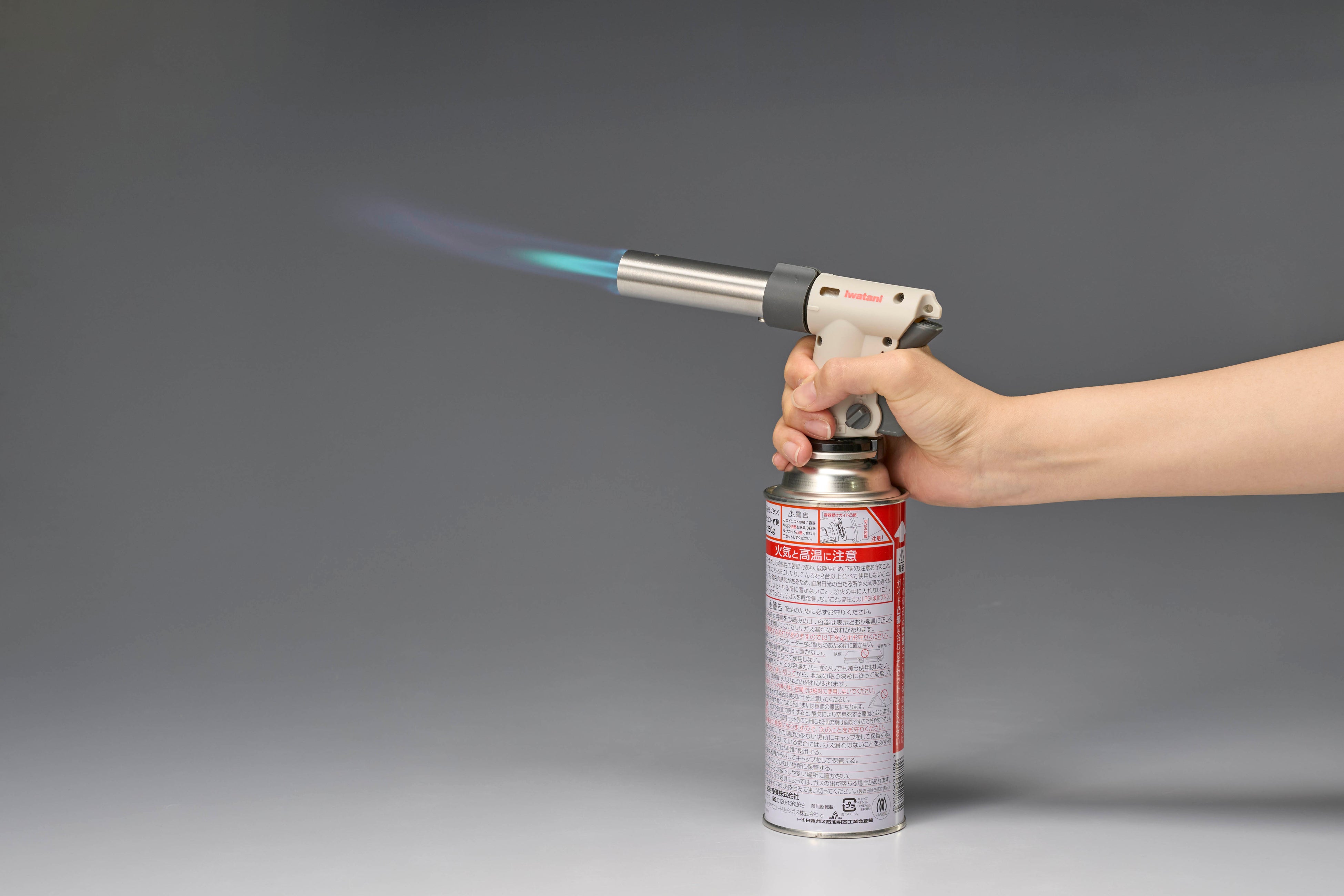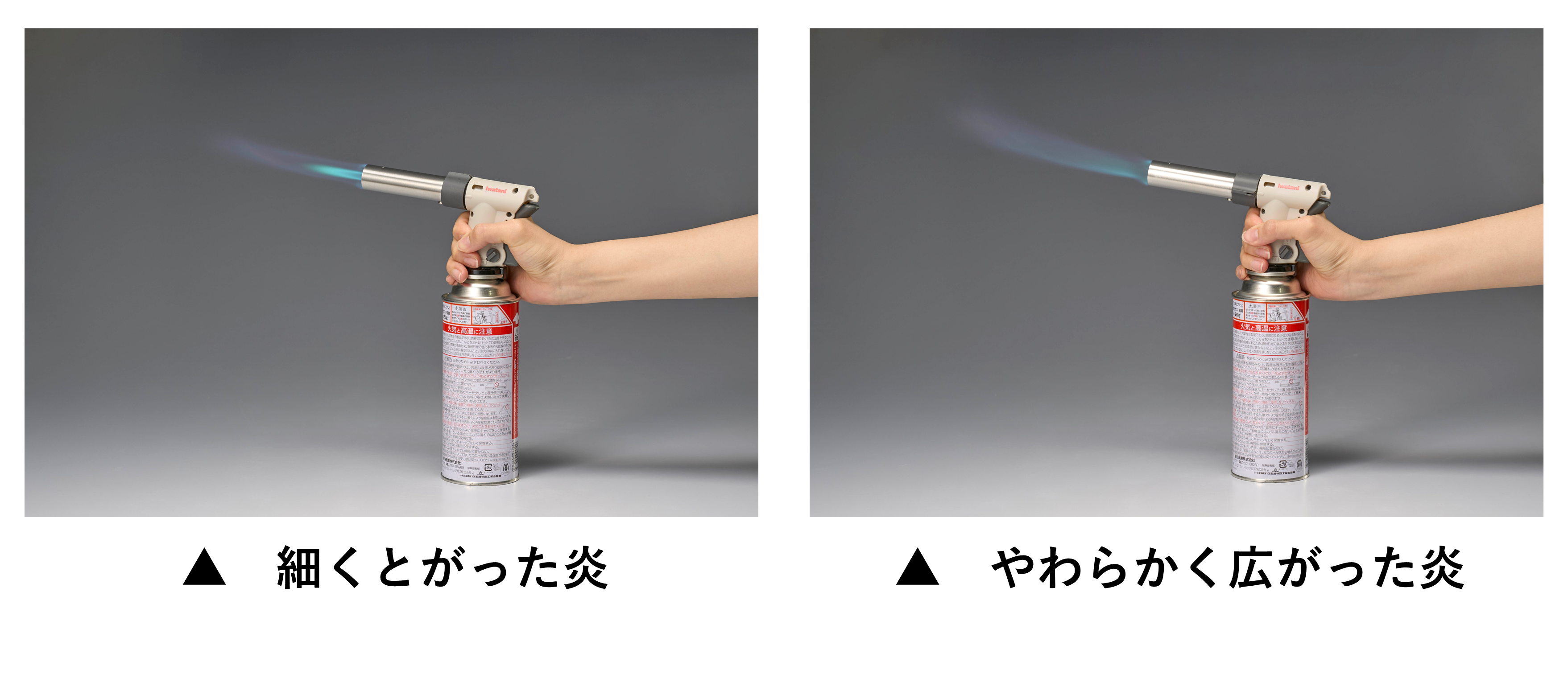 従来品(イワタニカセットガス“クッキングトーチバーナー”)に比べ、点火レバーを離してから消火にかかる時間が短くなりました。傾けてもガスが商品内部に滞らない設計で、点火レバーから手を離すと同時に消火します。火切れがよく安全・安心に、料理に合わせて自在にお使いいただけます。